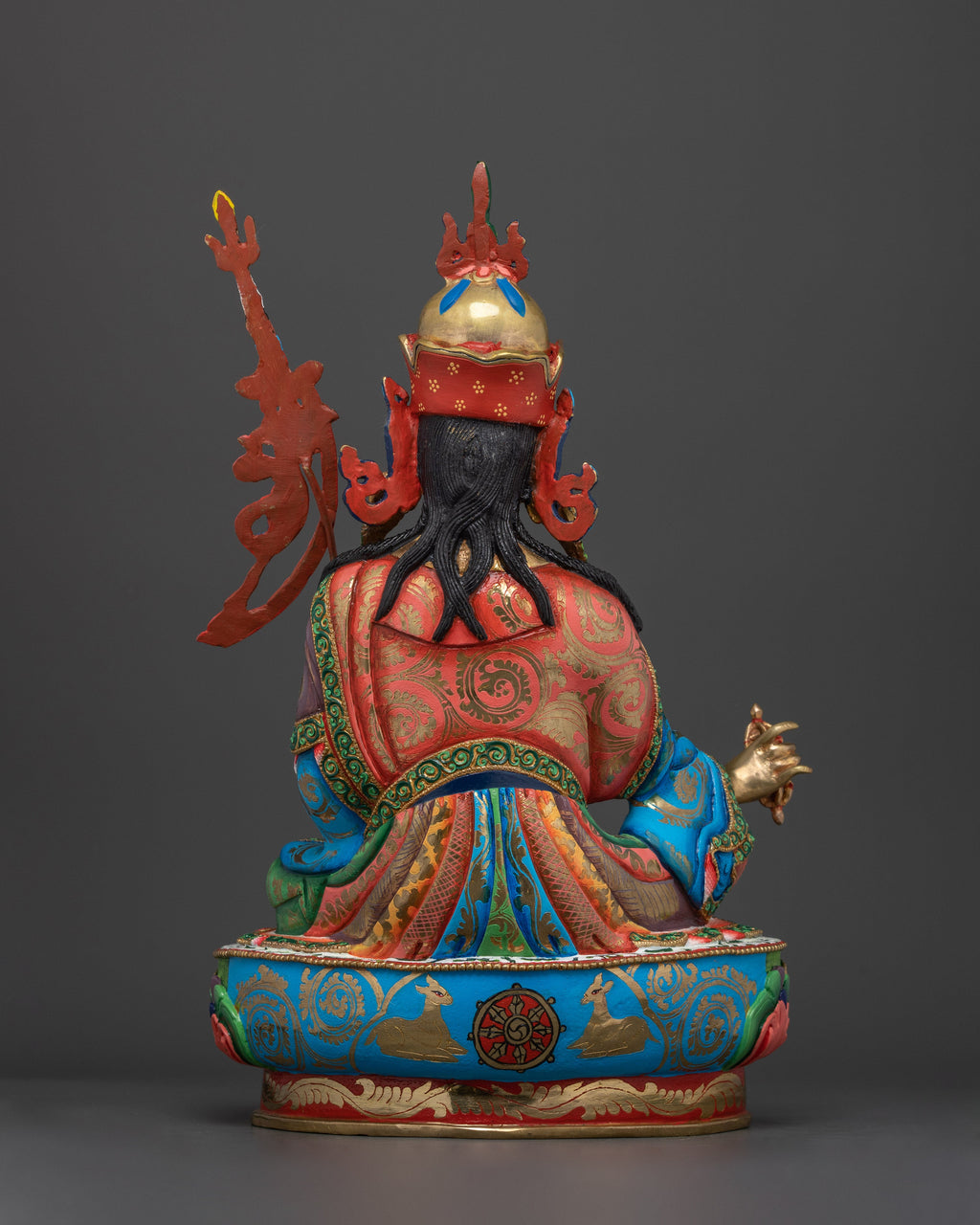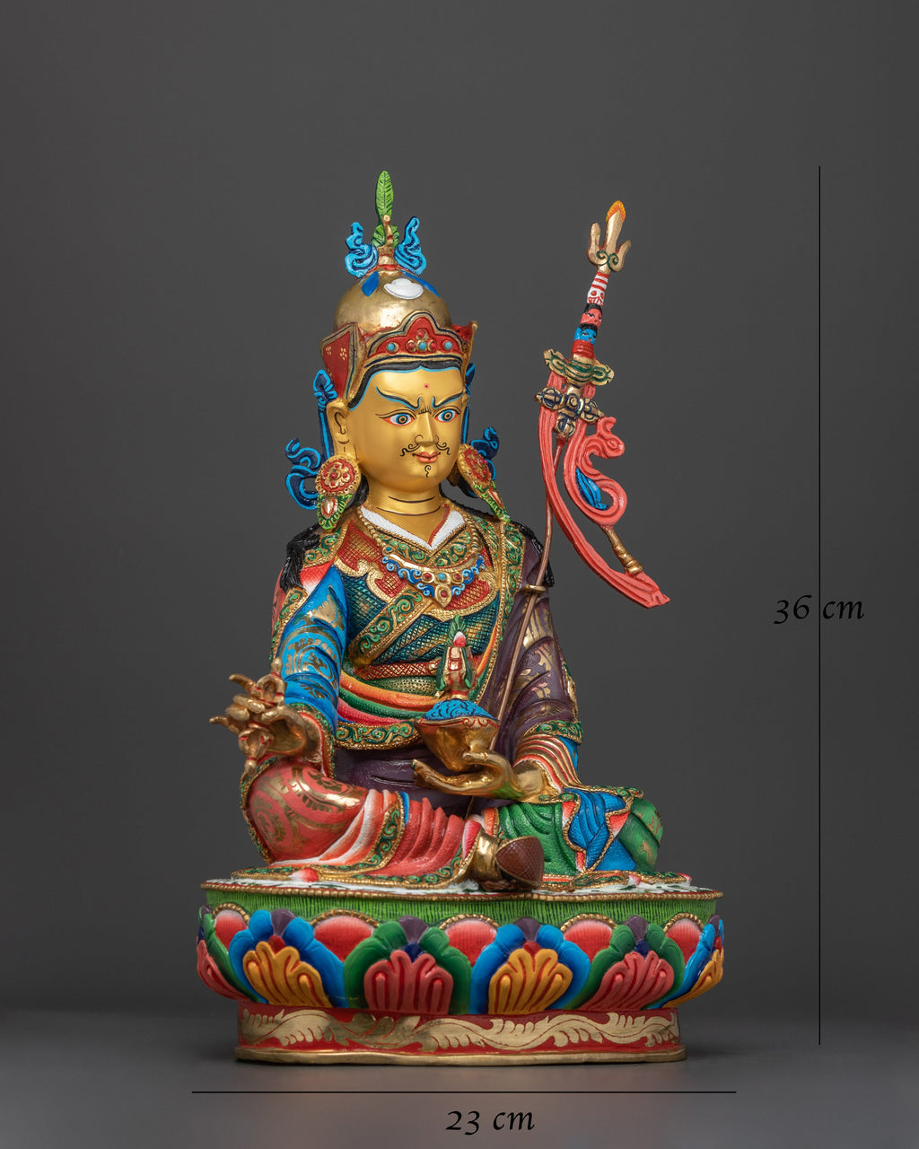 Each aspect, from his vajra scepter to the lotus throne, is highlighted with vibrant hues and precise painting techniques, heightening the statue's visual impact and symbolic significance. This statue is ideal for anyone who wants to connect with Guru Rinpoche's transforming energy and develop inner strength and spiritual awareness in their meditation practice or daily life.