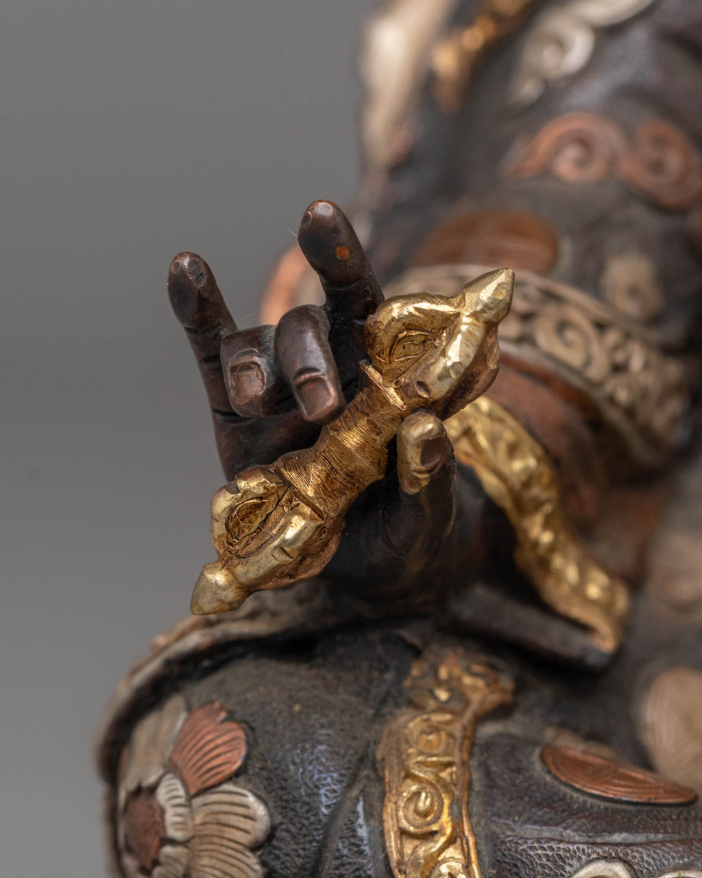 Expertly handcrafted by skilled Tibetan artisans, this copper Guru Rinpoche statue captures the spiritual essence and transformative power of one of Buddhism's most revered masters. Each intricate detail—from the flowing robes to the symbolic hand gestures—has been meticulously sculpted to honor Guru Rinpoche's enlightened presence. The radiant copper plating creates a surface that draws the eye and elevates any sacred space. Whether placed on your altar, in your meditation room, or in your spiritual sanctuary, this statue serves as a powerful focal point for devotion and practice. Beyond its artistic beauty, it functions as a spiritual anchor, helping you deepen your connection to Guru Rinpoche's blessings and wisdom teachings. This is more than decorative art—it's a tangible bridge between the material and spiritual worlds. Meditating with this statue can enhance your practice, inspire contemplation, and invite the protective and transformative energy of Guru Rinpoche into your daily life. A meaningful investment for serious practitioners and collectors alike.