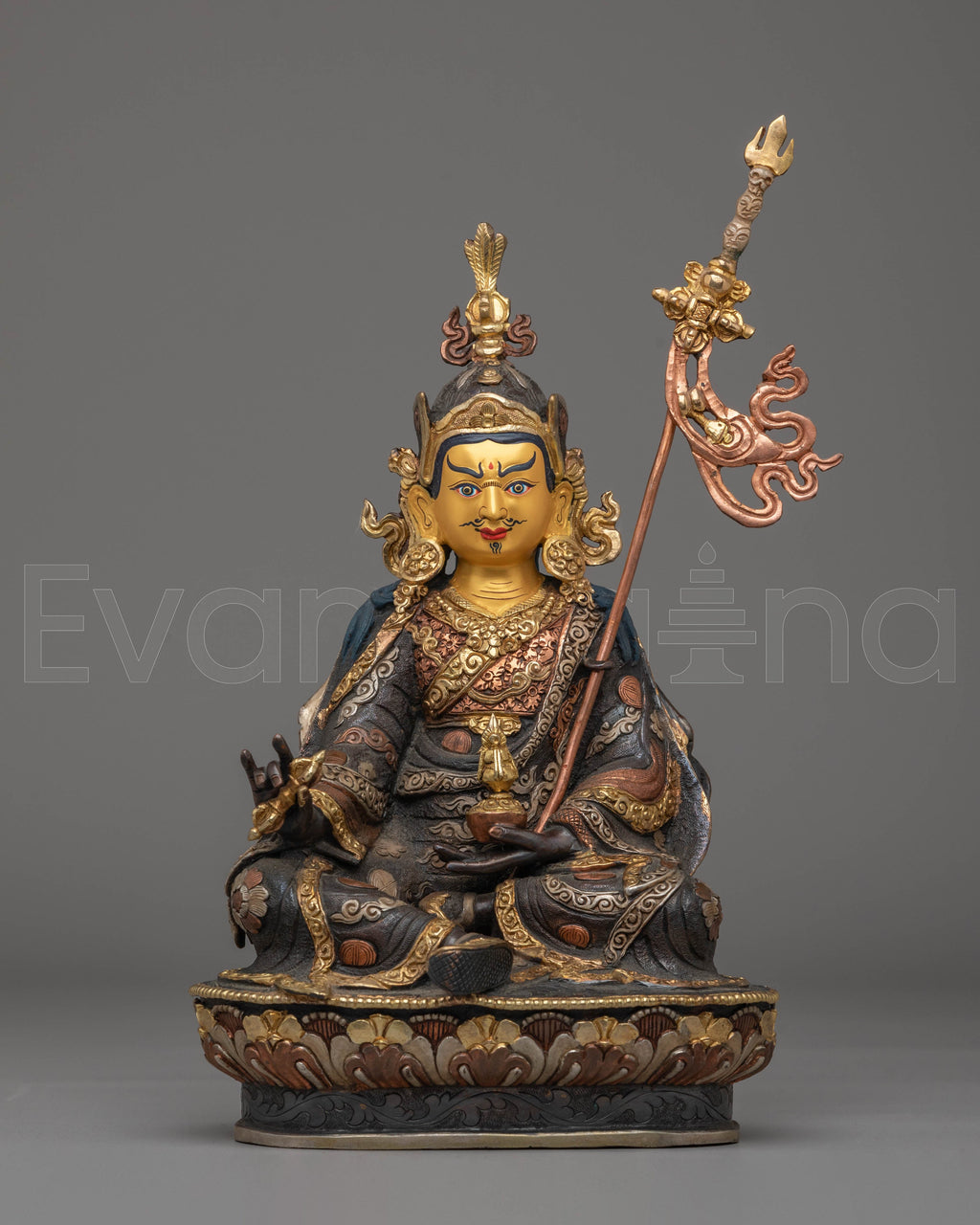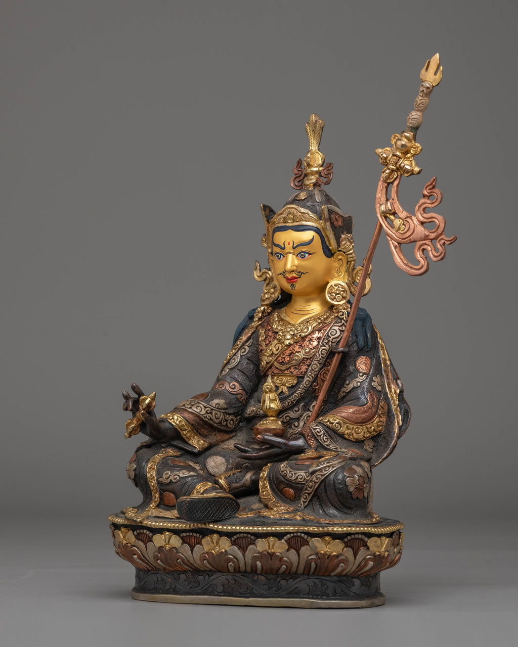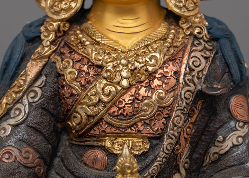 This handmade statue of Guru Rinpoche is crafted from copper, plated with 24K gold, and electro-gold and silver-plated for an elegant finish. It features acrylic colors, capturing the spiritual essence of the revered figure. Standing at 28cm tall, this statue serves as a powerful symbol of wisdom and compassion, bringing peace and enlightenment to any space.