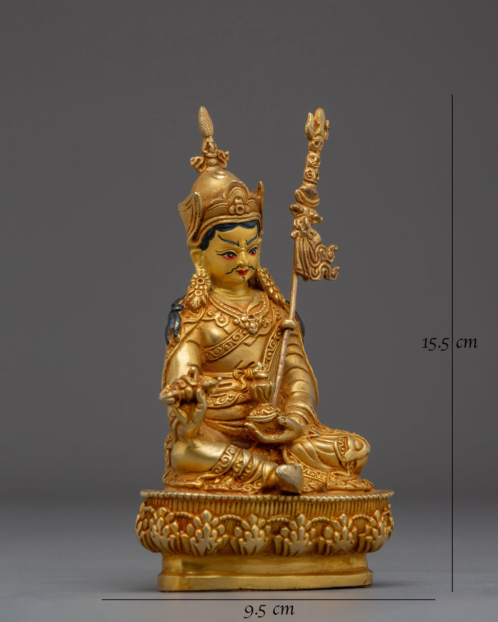 The Guru Rinpoche Copper Statue 24K Gold Gilded, also known as Padmasambhava, the founder of Tibetan Buddhism, represents enlightenment, compassion, and spiritual mastery. This handcrafted statue is 6.1" (Height) x 3.7" (Base) and weighs 0.57 kg. It is made of solid copper, adorned with 24K gold gilding, and enhanced with detailed gold and acrylic paints. Created by expert Nepalese artisans, it represents Himalayan Buddhism's holy traditions, making it an appealing addition to altars, meditation places, or sacred collections.