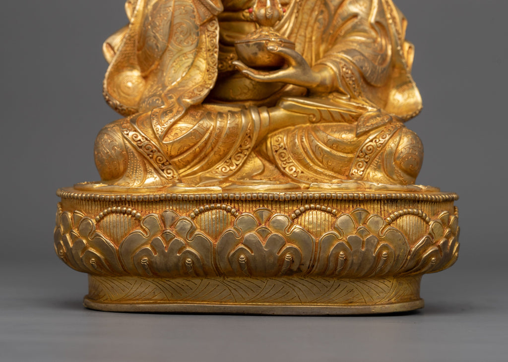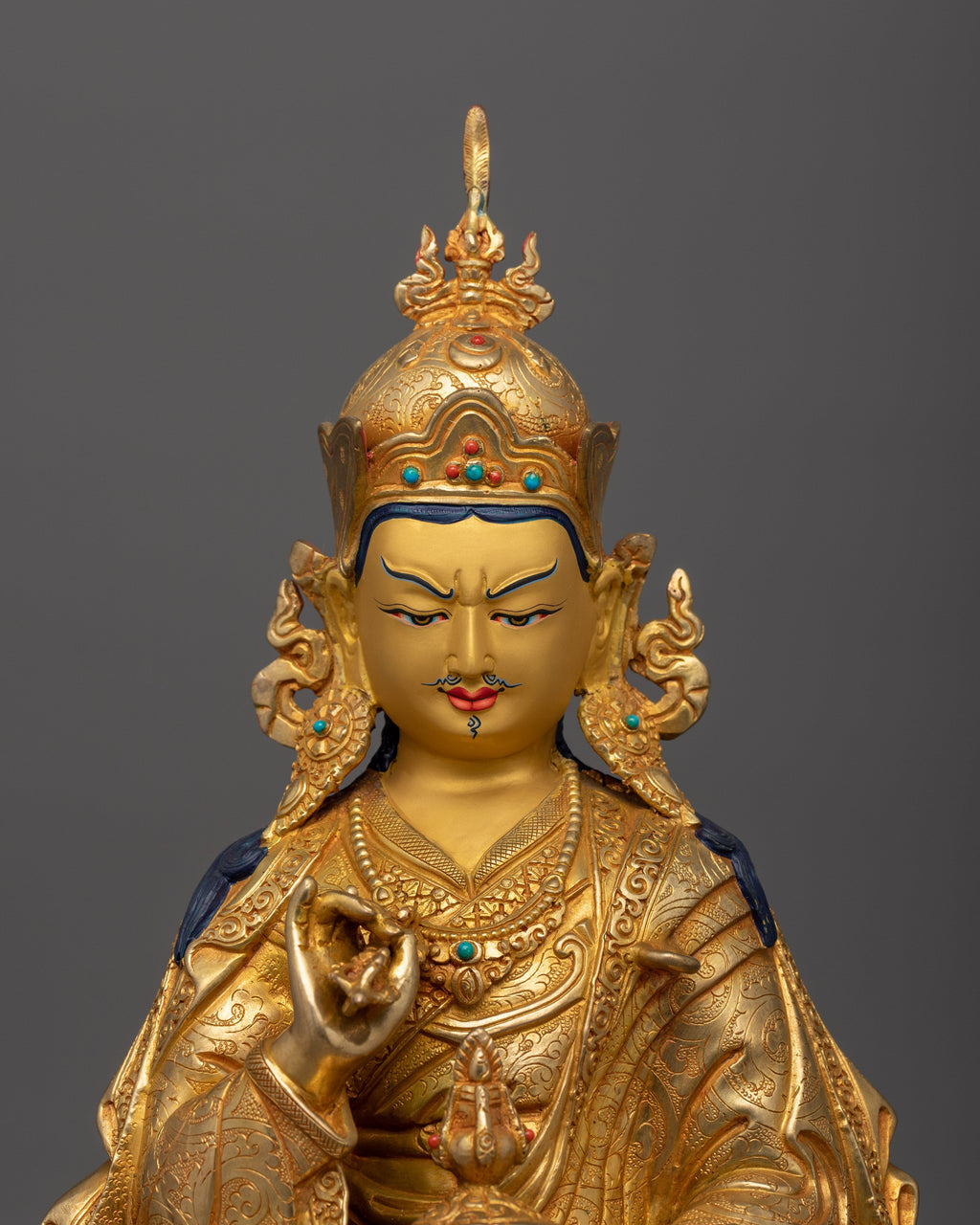 This finely carved statue honors Guru Rinpoche, the founder of Tibetan Buddhism, and his profound legacy. Standing 15.2" tall with a 10.6" base and weighing 4.15 kg, this statue is made of copper, gilded with 24K gold, and embellished with gold and acrylic paintings. The rich artistry of Nepalese craftsmanship can be seen in every curve and form, making this statue an ideal addition to altars, meditation rooms, or holy decor.
