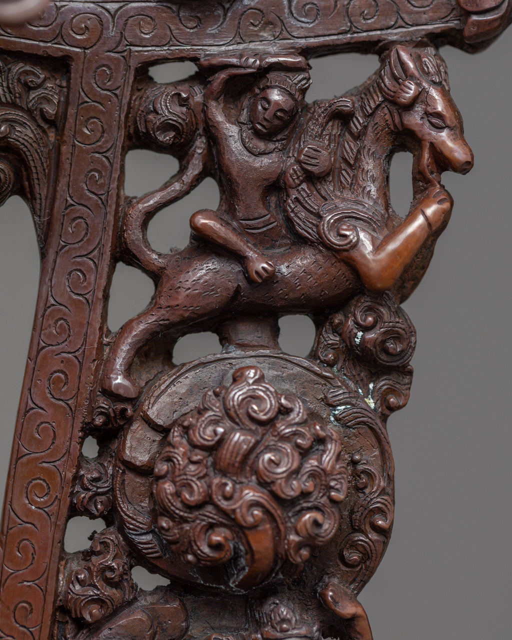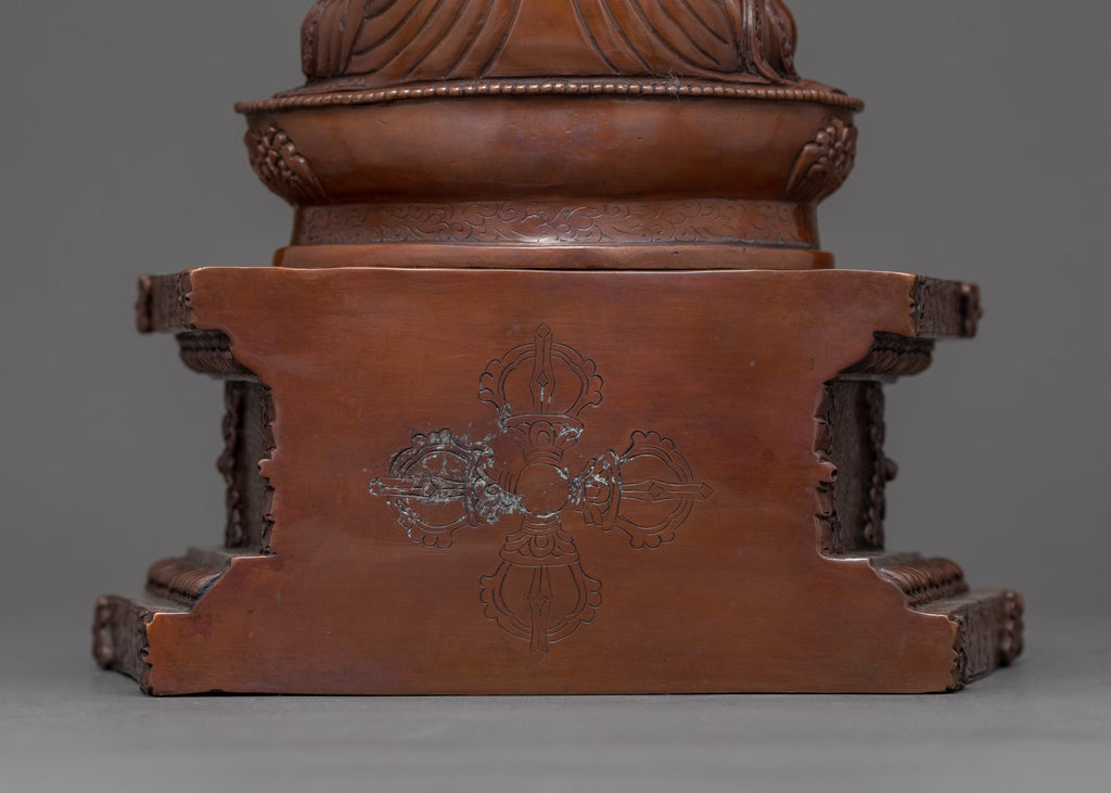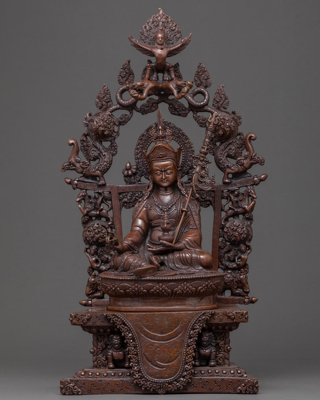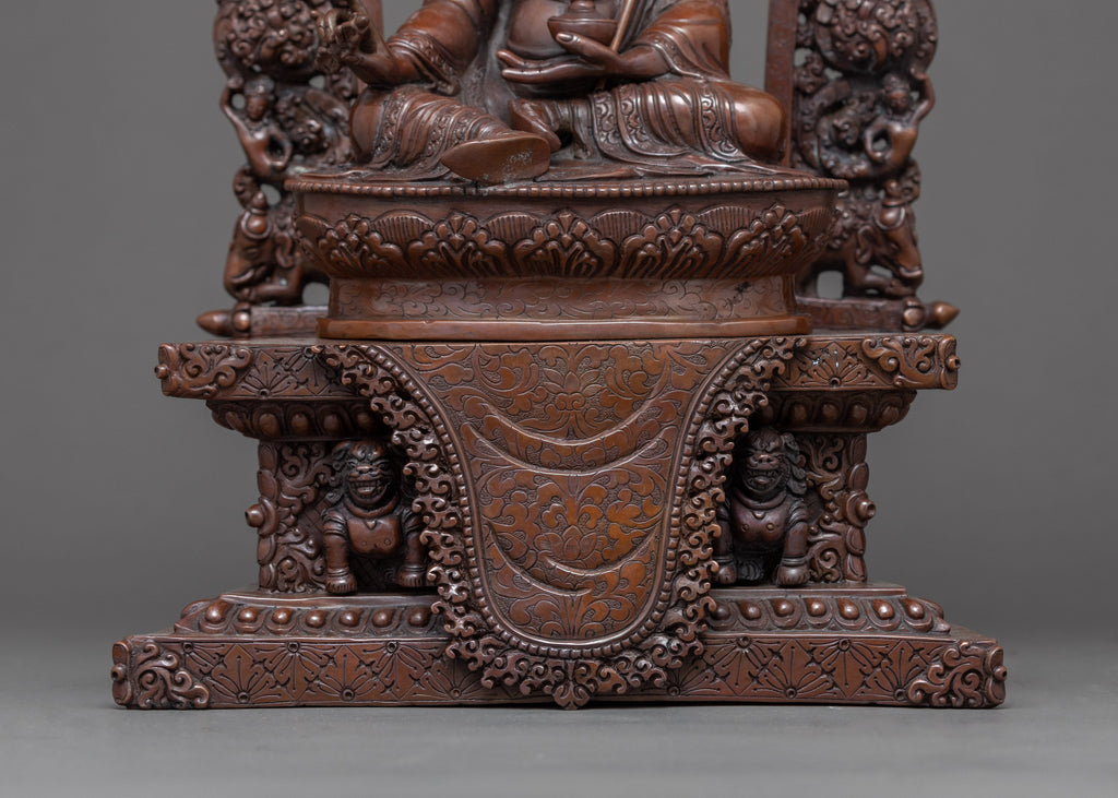 We have exquisitely hand-crafted sculpture of Guru Rinpoche or Guru Padmasambhava in an oxidized copper body in traditional style. You can use this Tibetan statue in different Buddhist rituals or occasions and even for your regular meditational purpose. We are the artist of Kathmandu valley whose artisan in making ancient Vajrayana statues has passed from generation to generation and has played a significant role in it. In this statue, we have depicted a deity seated on top of a moon disc lotus seat with a semi-wrathful expression. He holds a vajra in his right hand while a vase in his left-hand carries a trident in his left arm. This art of Himalayan will be a great gift from Nepal to a practitioner like you.