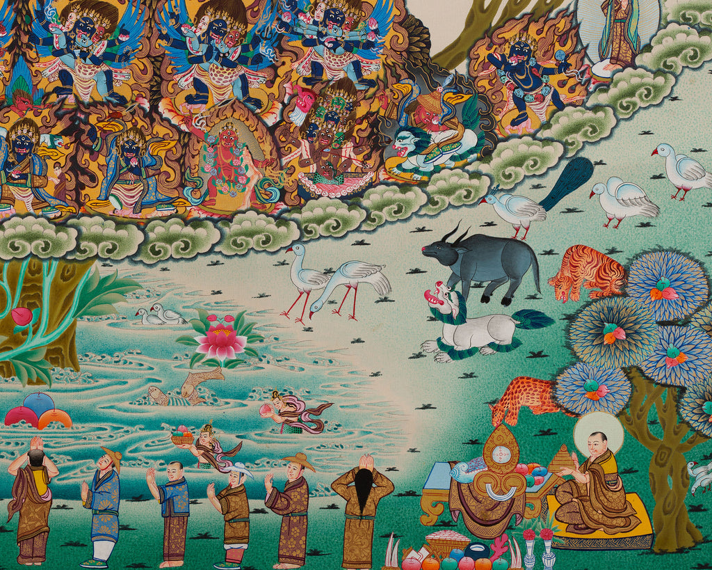 Each branch of the lineage tree represents a unique lineage, visually connecting practitioners to a rich heritage of wisdom and spiritual practice. The detailed and intricate artwork not only highlights the significant figures within Guru Rinpoche’s lineage but also symbolizes the unbroken transmission of Vajrayana teachings. The inclusion of various spiritual masters emphasizes the diversity and depth of the teachings that have been passed down, ensuring the continuity of spiritual wisdom.