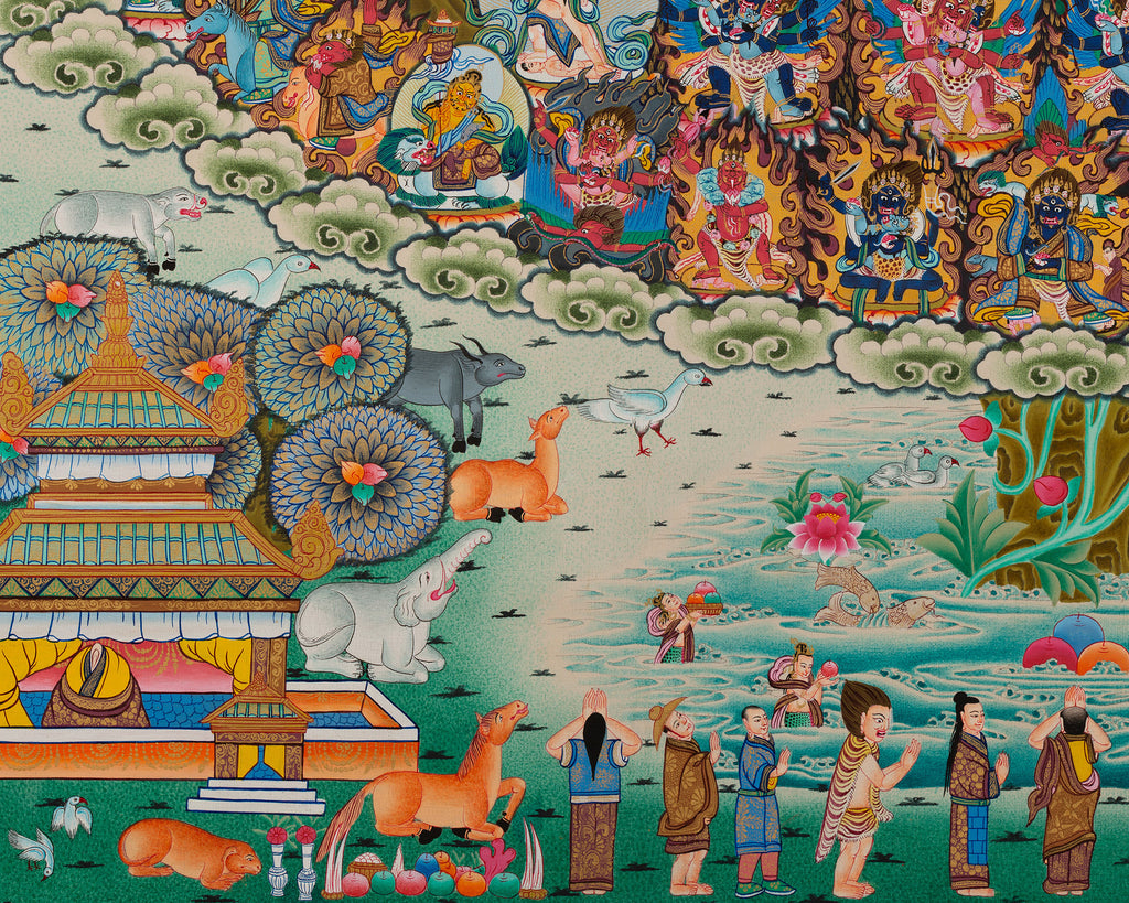 As you requested for consecrations/blessings, we can take the thangka to nearby monasteries/Rinpoches from the Boudha Stupa. We kindly ask that you contribute $50 to the monasteries for these blessing/consecration services.