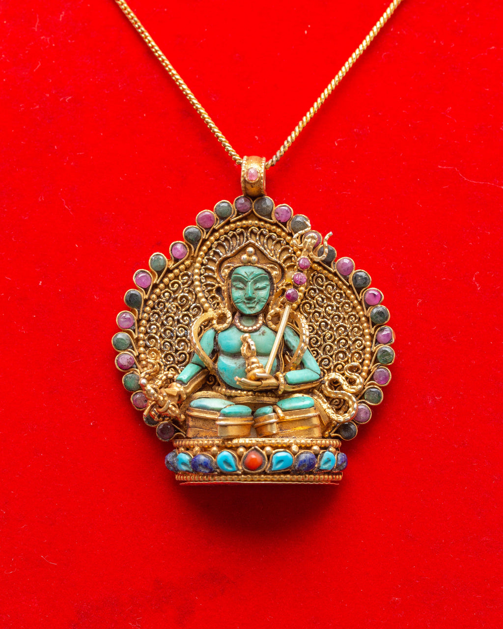 The Guru Rinpoche locket's exquisite design includes a finely carved figure of Guru Rinpoche in a peaceful and serene position, holding the Vajra (power symbol) and lotus flower (purity symbol). The surrounding gemstones symbolize the harmonious combination of wisdom and compassion, as well as the transformative force of Guru Rinpoche's blessings. The lapis lazuli represents wisdom and insight, the ruby provides vigor and protection, the panna promotes spiritual clarity, and the coral increases strength and healing energy.