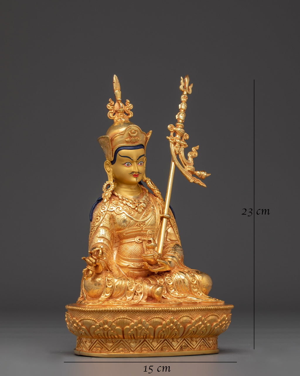 This Vajra Master Guru Rinpoche Machine-Made Statue stands at 9.1”/23cm in height and 5.9”/15cm at the base, weighing 1.29 kg. Crafted from copper with electro-gold plating and featuring detailed gold and acrylic paintings, this statue combines traditional symbolism with modern manufacturing techniques. It is suitable for home altars, meditation spaces, or as a spiritual decor item.