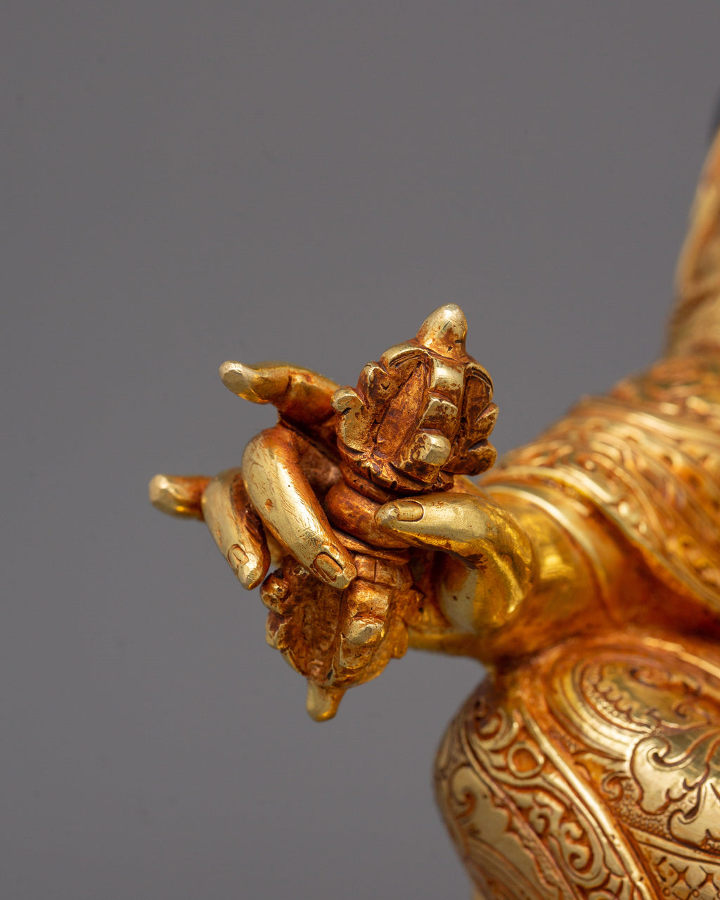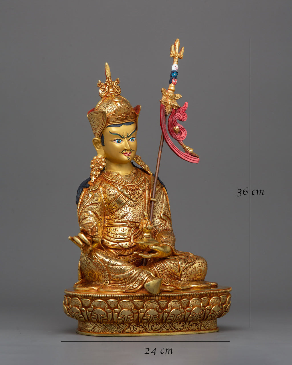 This Guru Rinpoche Master of Vajrayana Buddhism Figurine stands at 14.2 inches (36 cm) in height, with a base width of 9.4 inches (24 cm). Crafted from copper, the statue features a brilliant 24K gold-gilded finish, enhanced with intricate gold and acrylic paintings that bring out the fine details of Guru Rinpoche’s attire and features. Depicting Padmasambhava, the Lotus-Born Master, this statue captures his wisdom, compassion, and spiritual power.