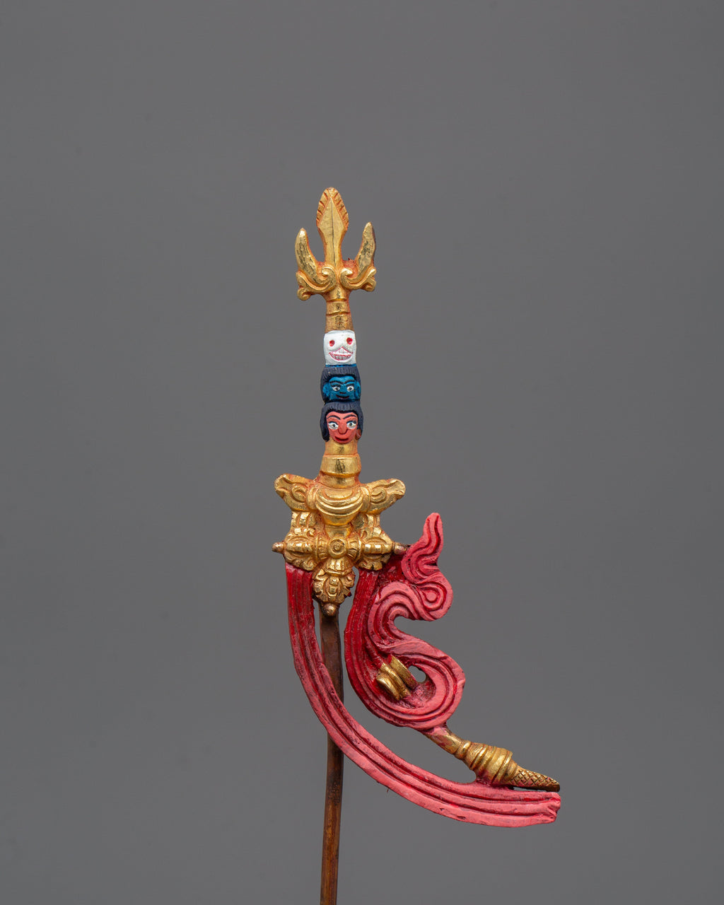 Guru Rinpoche is represented sitting in a royal posture, presenting confidence and spiritual mastery. His right hand holds a vajra, which represents indestructible power, while his left hand holds a skull cup (kapala) filled with the nectar of wisdom. The khatvanga, a trident ornamented with symbolic components reflecting his tantric attainment and the union of wisdom and compassion, rests on his left shoulder.