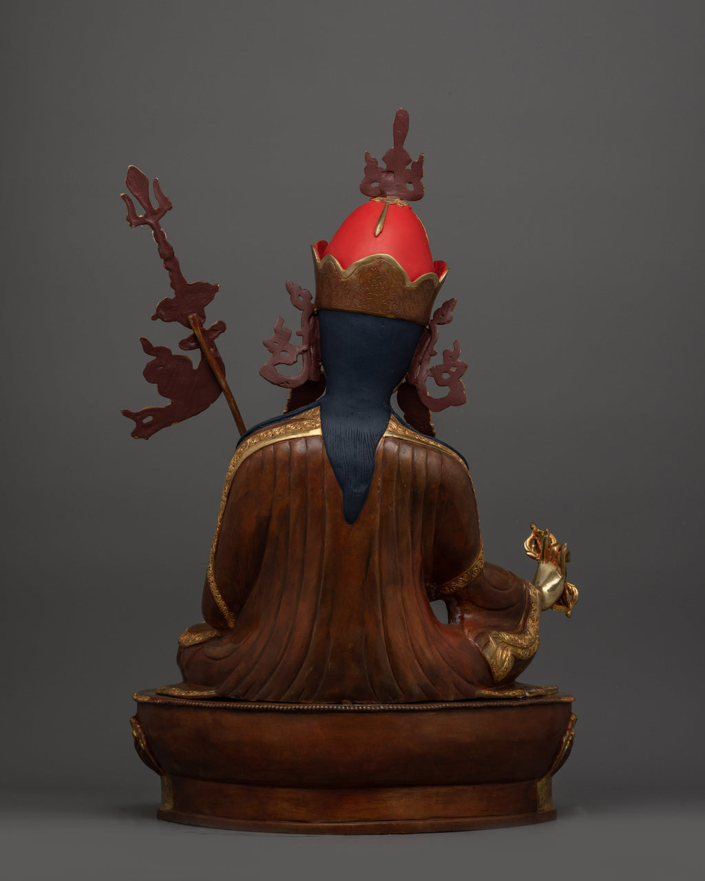 The Guru Rinpoche Oxidized Copper Sculpture is a depiction of the founder of Tibetan Buddhism, Padmasambhava. This statue, which stands 21.9" (55.5 cm) tall and 14.2" (36 cm) at the base is made by hand from oxidized copper, gold, and acrylic paintings and 24K gold gilding.