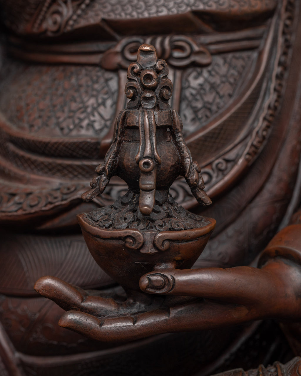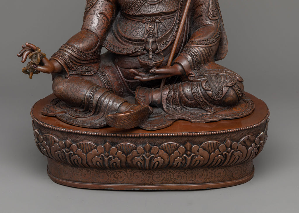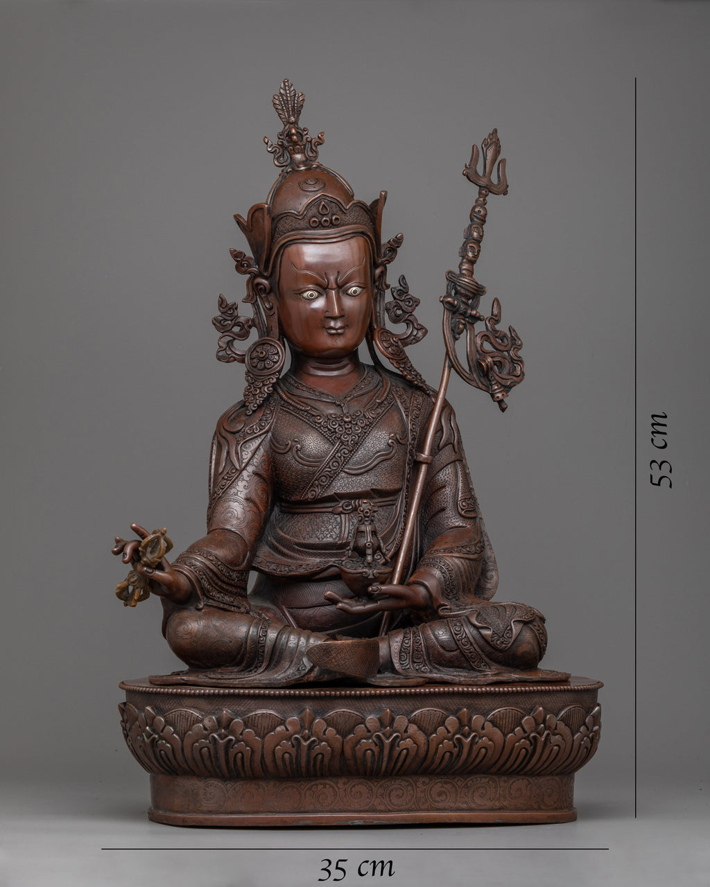 Introducing our handcrafted, premium-quality Guru Rinpoche Statue, which was meticulously crafted in Nepal along with many other Copper Sculptures. This oxidized copper figure, which is 20.8 inches (53 cm) tall and weighs 10.58 kg, is the ideal complement to any shrine or home decor. In this statue, Guru Rinpoche is shown in his classic pose, sitting on a lotus throne with his left hand on his lap and his right hand clutching a vajra. This magnificent sculpture was made by our artists using traditional methods, and it perfectly captures the spirit of Guru Rinpoche through its complex intricacies and iconography. The statue's rusted copper body gives it depth and personality, making it a wonderfully distinctive artwork.