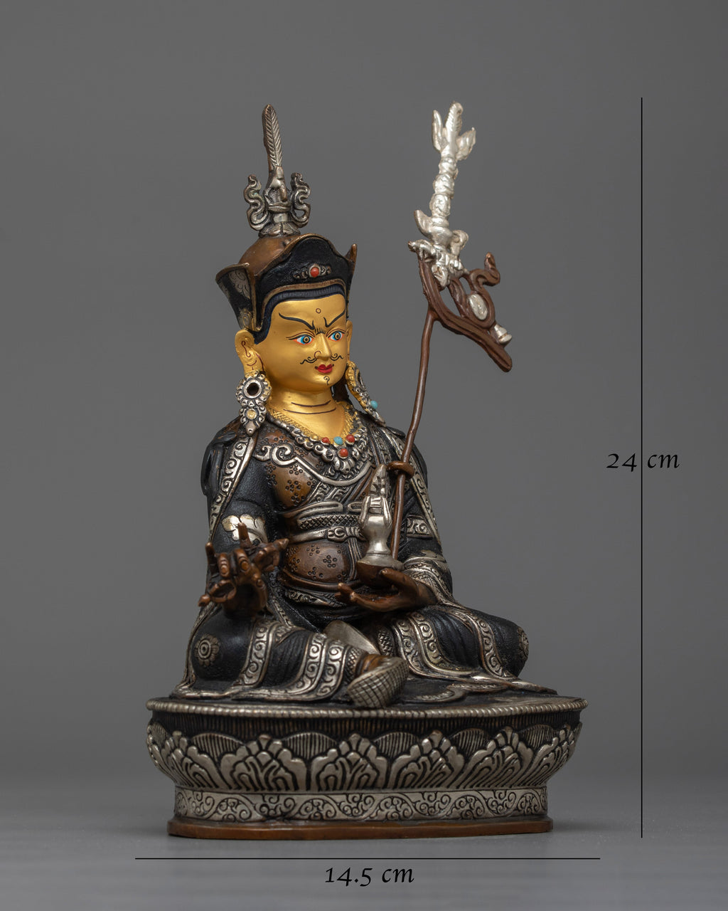 Discover the "Guru Rinpoche Oxidized Silver-Plated" statue, a stunning depiction of the respected spiritual master. This statue stands 9.4 inches tall and weighs 1.53 kg. It is skillfully constructed from an oxidized copper body with a beautiful silver coating. The gold and acrylic paintings highlight the precise features of Guru Rinpoche's tranquil demeanor, graceful posture, and the symbolic things he holds, which represent profound spiritual insight and protection.