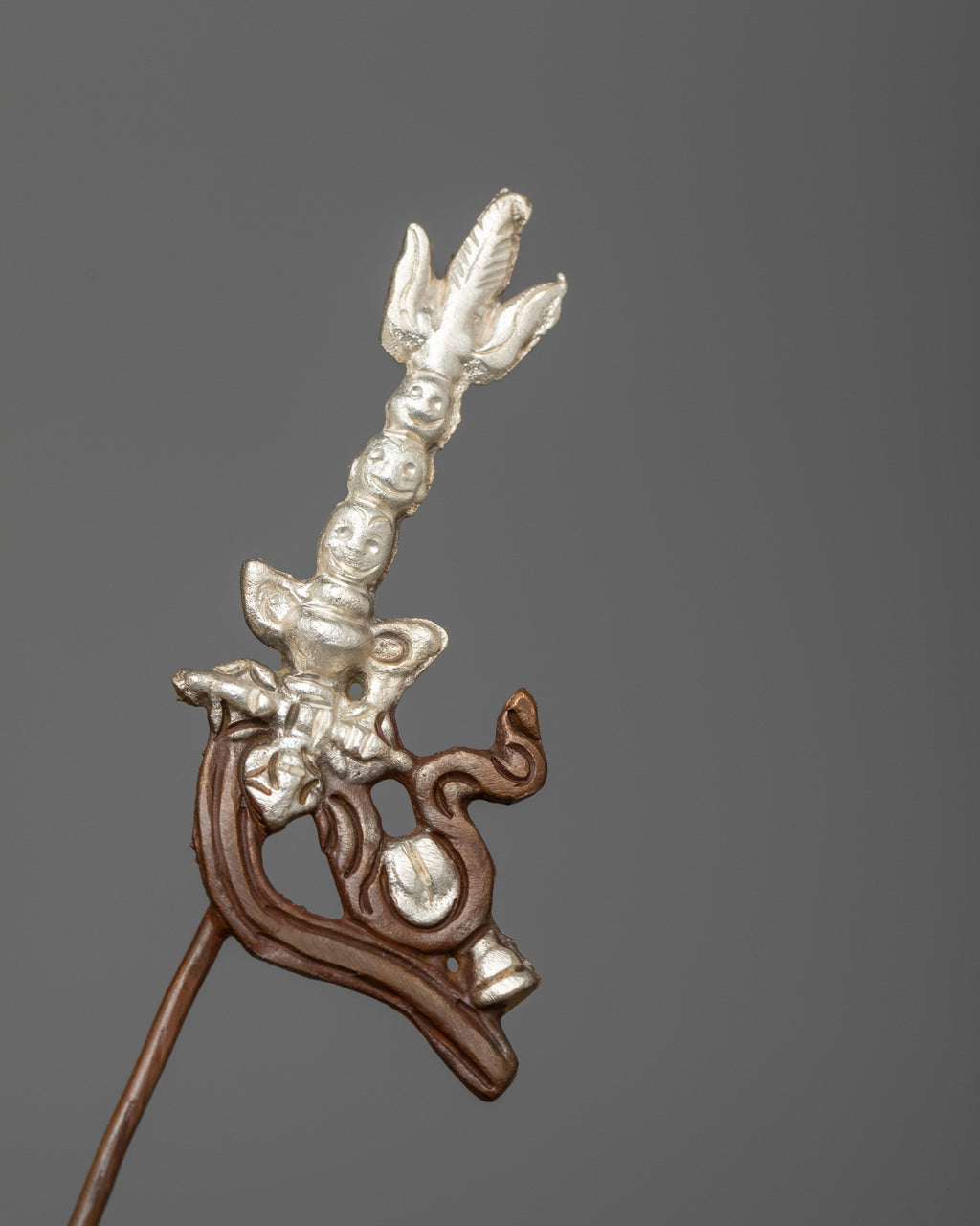 Guru Rinpoche is represented sitting in a royal posture, presenting confidence and spiritual mastery. His right hand holds a vajra, which represents indestructible power while his left hand holds a skull cup (kapala) filled with the nectar of wisdom. The khatvanga, a trident ornamented with symbolic components reflecting his tantric attainment and the union of wisdom and compassion, rests on his left shoulder.