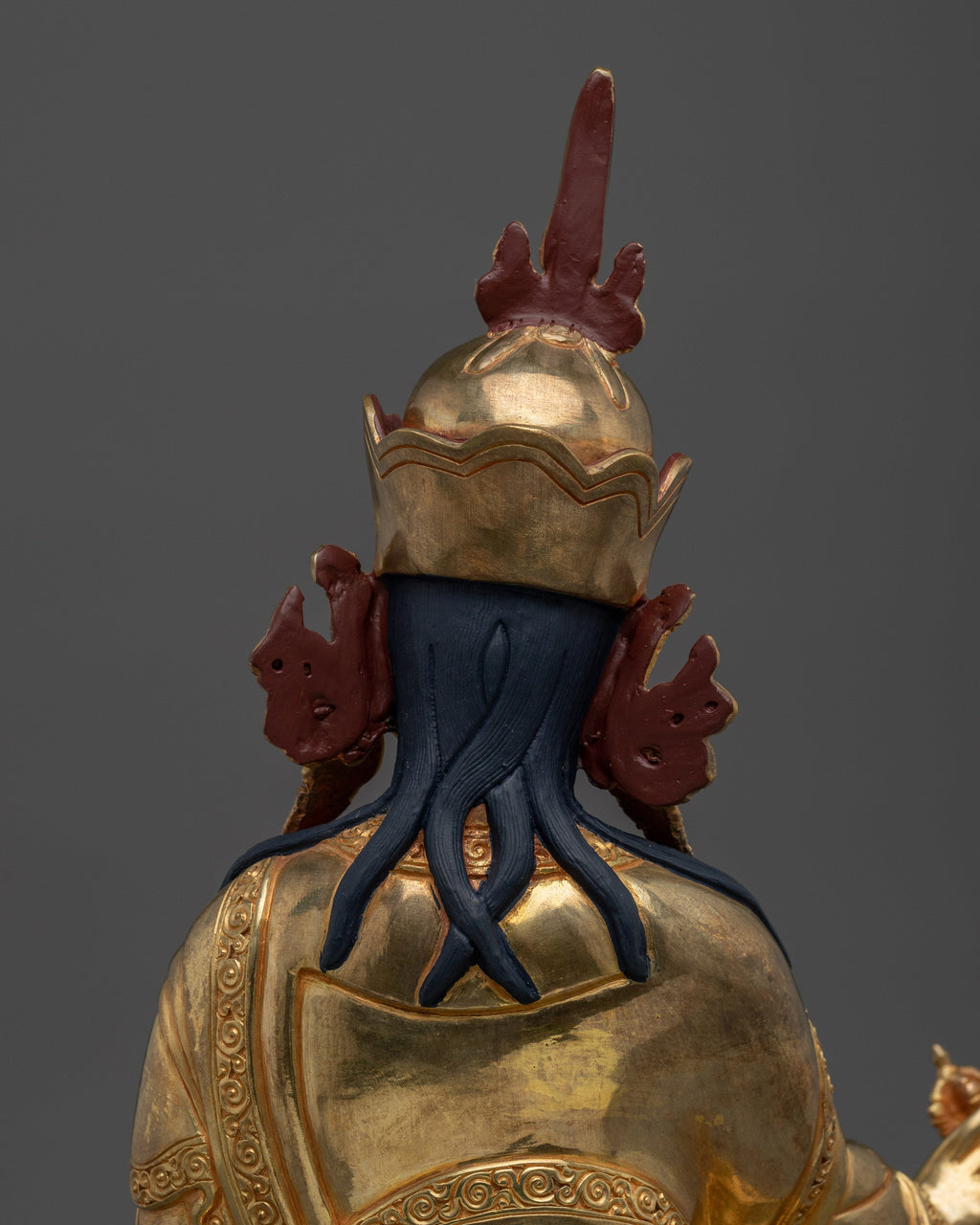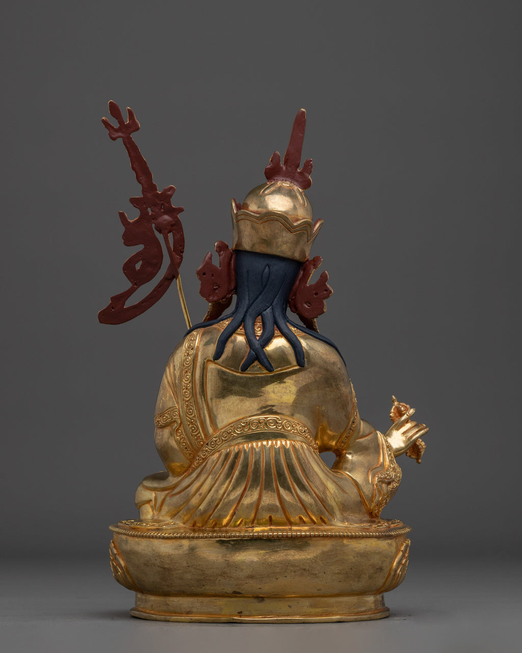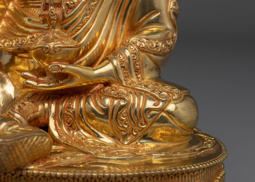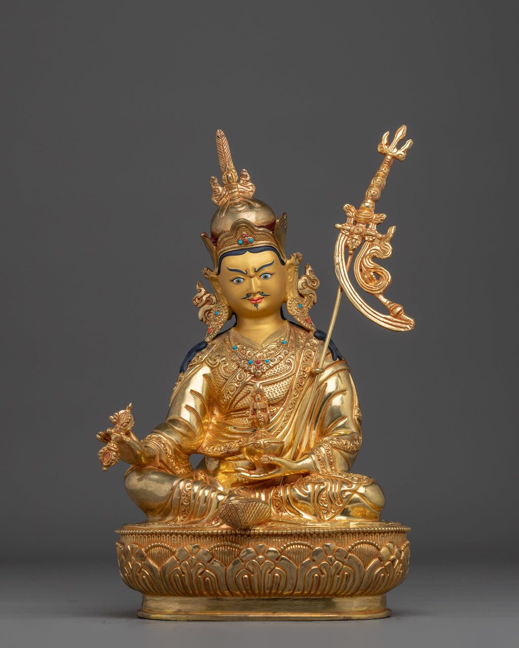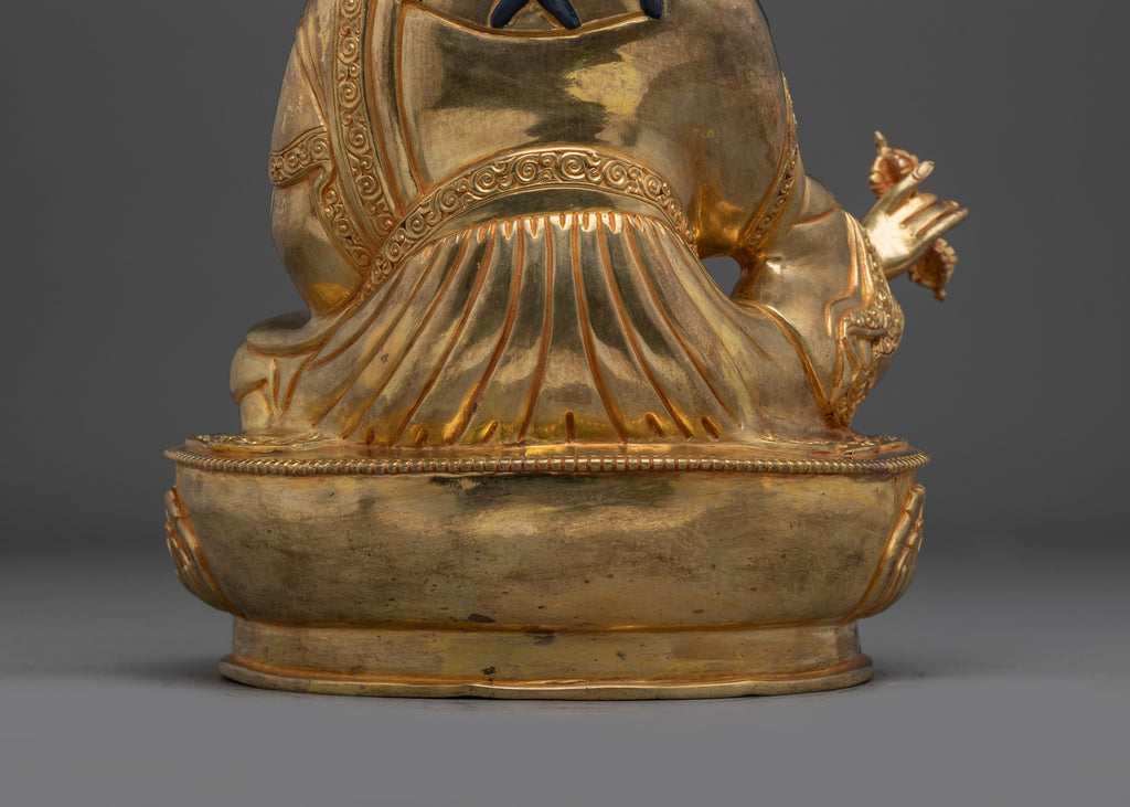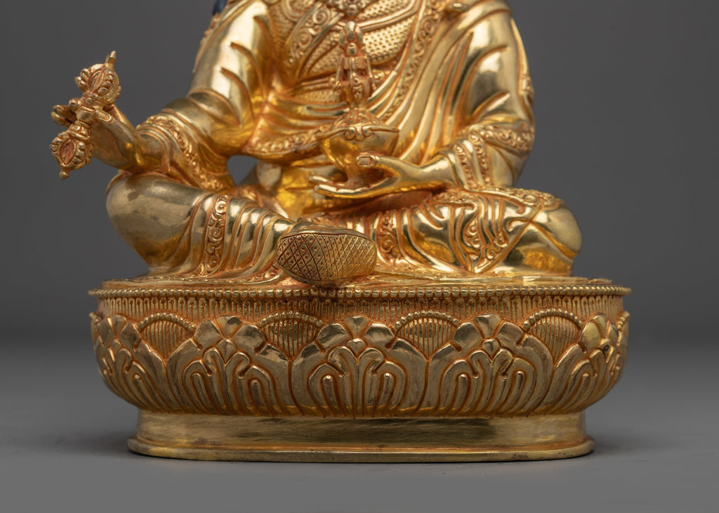 This shining Guru Rinpoche Padmasambhava Copper Statue is 14.2 inches tall and was skillfully made by Nepalese craftsmen with a copper body, elaborate gold and acrylic painting, and shining 24K gold gilding. Every detail, from the tranquil countenance to the exact setup of hand-set jewels, reflects Padmasambhava, the lotus-born guru who introduced Vajrayana Buddhism to Tibet. His recognized staff and vajra symbolize enduring knowledge and spiritual force.