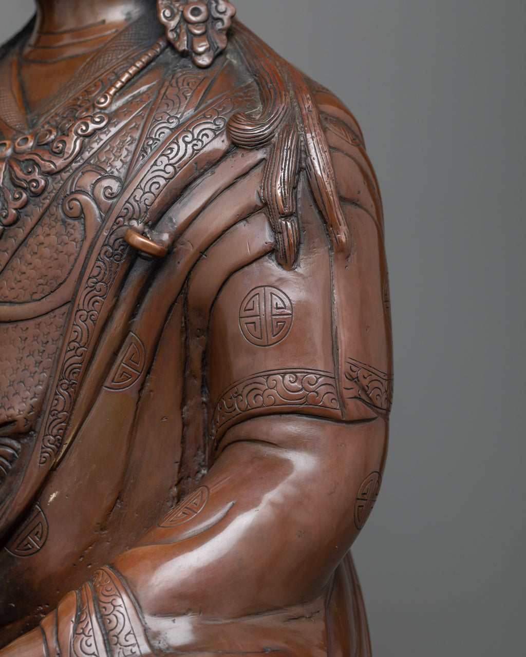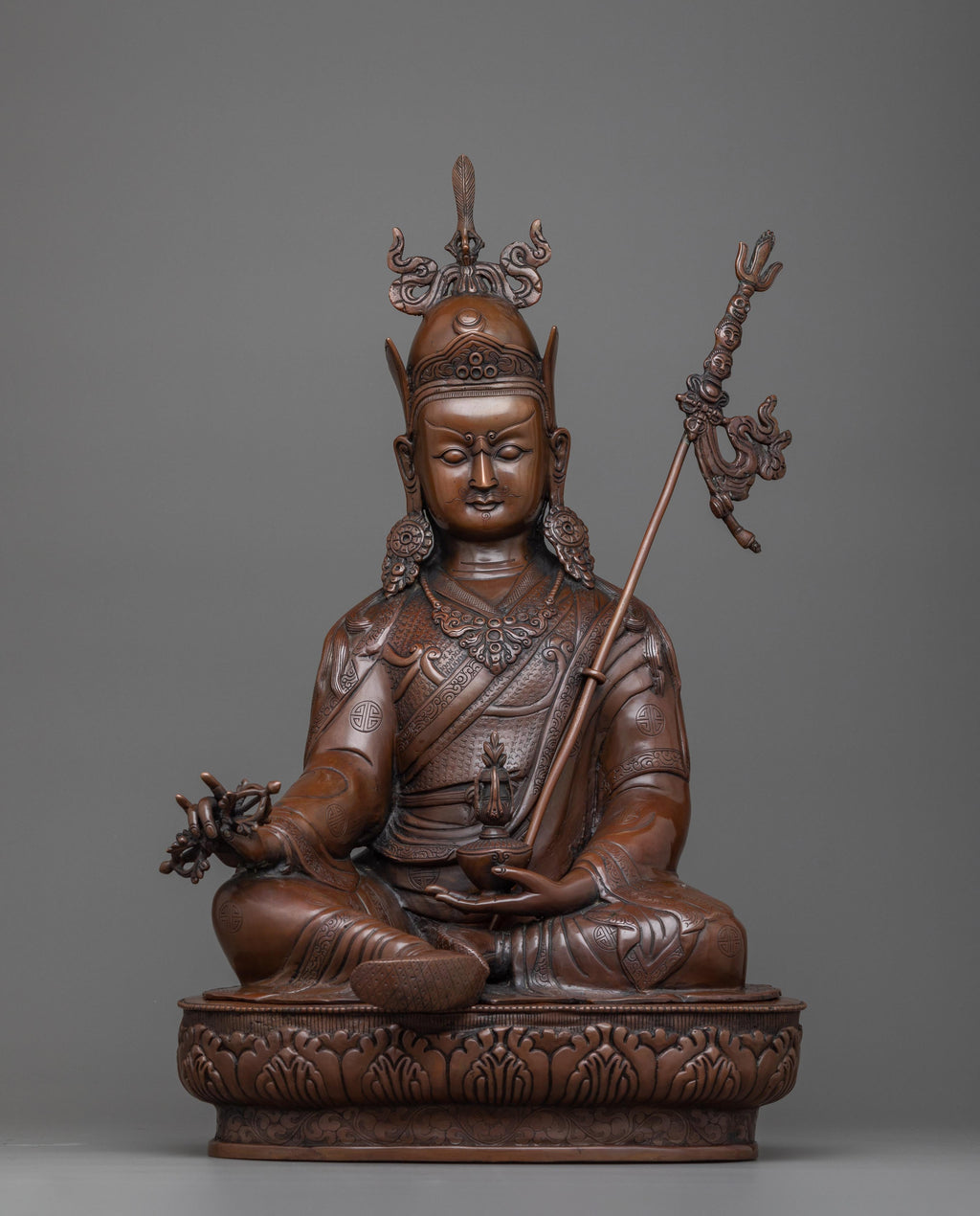 Our exquisite Guru Rinpoche Statue brings the grace and majesty of the Lotus Born Master Padmasambhava to your home. Handcrafted from the finest copper alloy, the 20.8-inch tall figure exudes beauty and wonder, a perfect piece for any collector of luxury art. Bring a sense of serenity to your space with this graceful and timeless reminder of the power of the Tantric Buddhist Vajra Master.