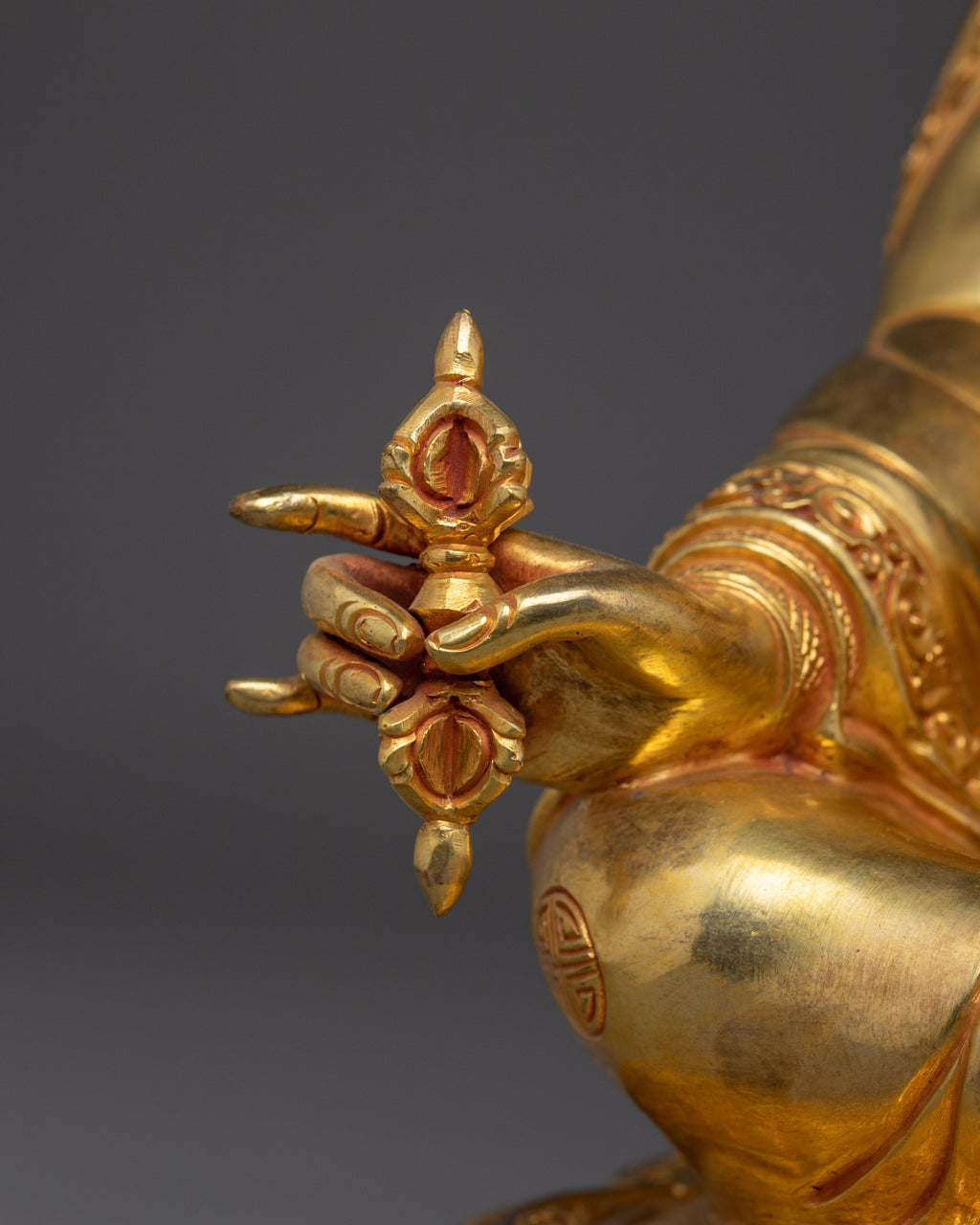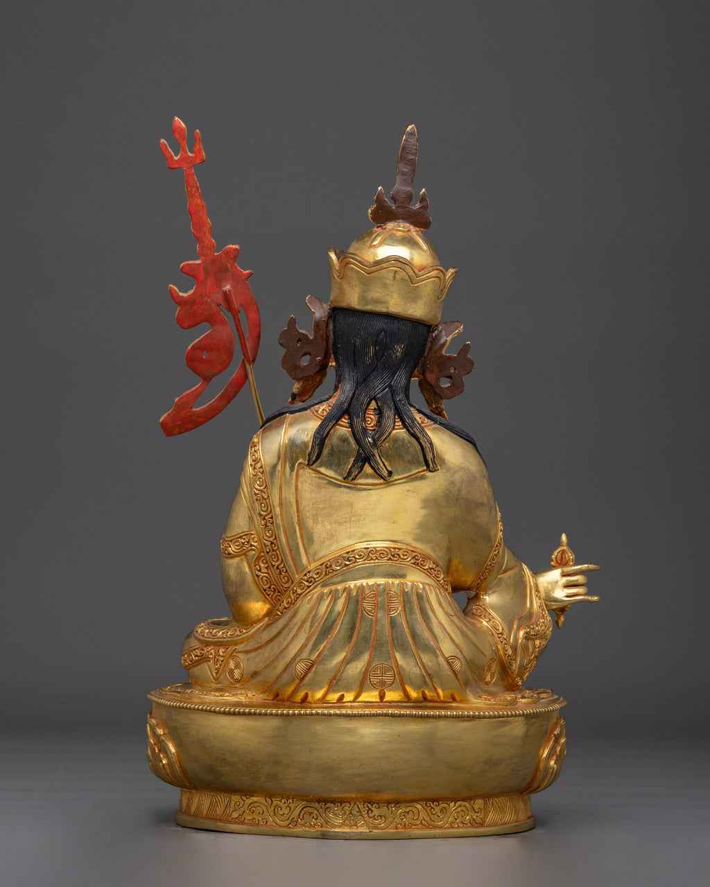 This stunning 14.4-inch Guru Rinpoche Statue in Copper, also known as Padmasambhava, is an admired representation of enlightened knowledge. The statue was expertly created in Nepal from copper and gilded in 24K gold. It contains finely detailed gold and acrylic painting. His regal position, peaceful smile, and symbolic items (vajra, skull cup, and staff) reflect his status as the great tantric teacher who introduced Buddhism to Tibet.