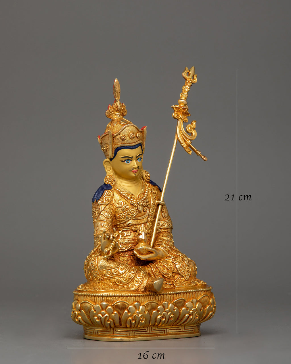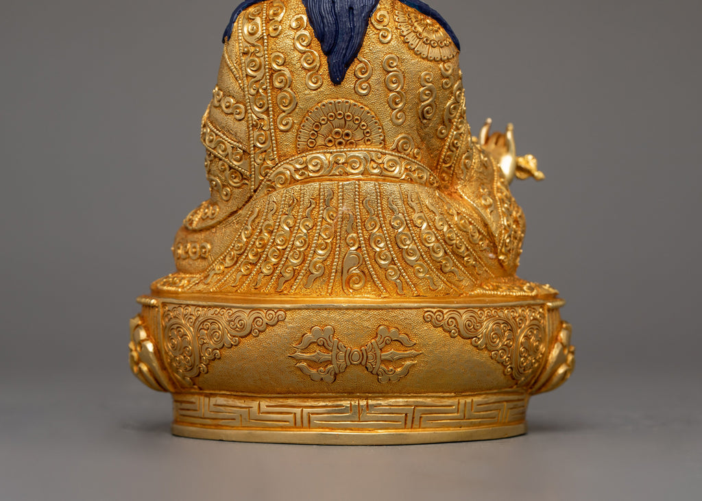 The Guru Rinpoche Statue "Master of Vajrayana Buddhism", also known as Padmasambhava, the founder of Tibetan Buddhism, represents enlightenment, compassion, and spiritual mastery. This handcrafted statue is 8.3" (Height) x 6.3" (Base) and weighs 1.26 kg. It is made of solid copper, adorned with 24K gold gilding, and enhanced with detailed gold and acrylic paints. Created by expert Nepalese artisans, it represents Himalayan Buddhism's holy traditions, making it an appealing addition to altars, meditation places, or sacred collections.