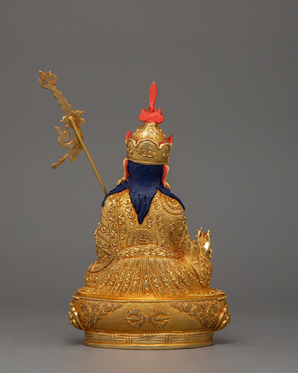 Guru Rinpoche is represented sitting in a royal posture, presenting confidence and spiritual mastery. His right hand holds a vajra, which represents indestructible power while his left hand holds a skull cup (kapala) filled with the nectar of wisdom. The khatvanga, a trident ornamented with symbolic components reflecting his tantric attainment and the union of wisdom and compassion, rests on his left shoulder.
