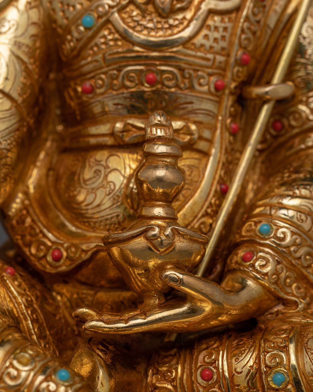 Each and every part of this statue, including the intricate designs on Guru Rinpoche's robes and his facial expressions, has been skillfully carved. The sculpture has been given elegance and spiritual meaning by the artists' precise attention to detail. In addition to signifying the holiness of Guru Rinpoche, the gold gilding highlights the artists' amazing skill. For those looking for a work of art that captures the spirit of tantric protection and knowledge, this statue is perfect.