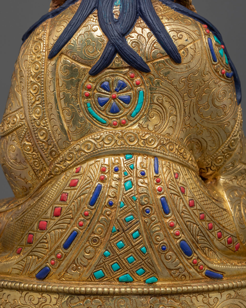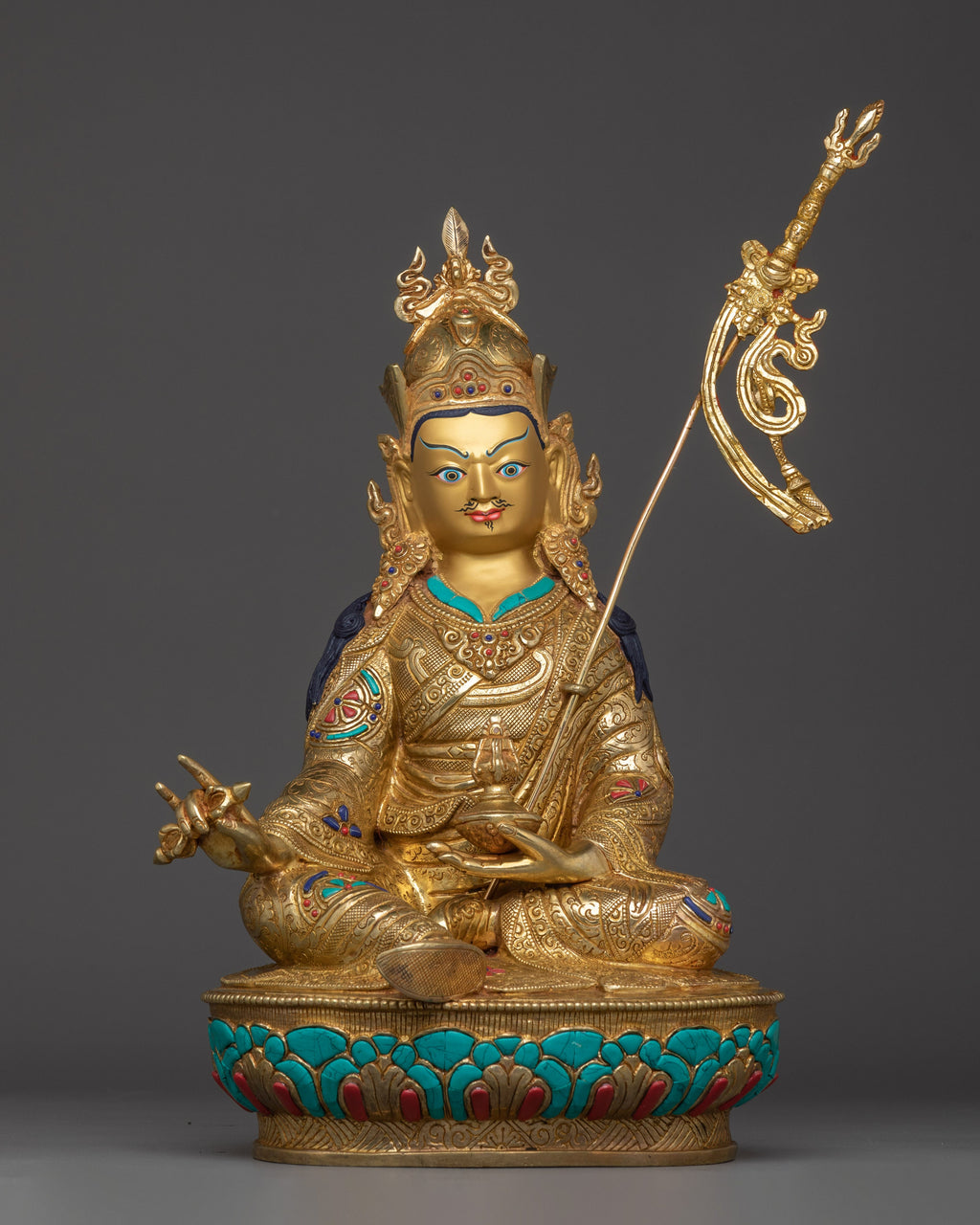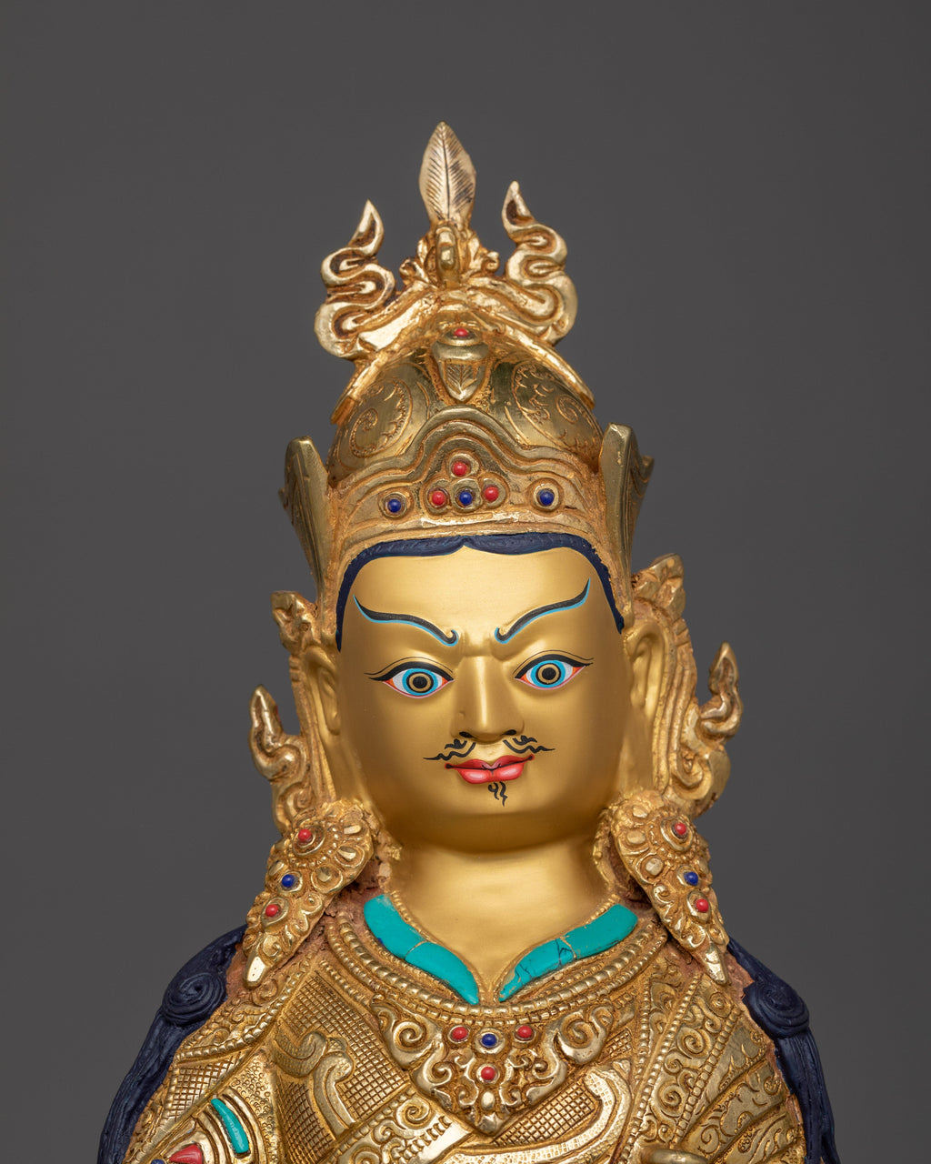 This Guru Rinpoche (Padmasambhava) statue measures 16.1 inches (41 cm) in height and 6.7 inches (17 cm) at the base, with a weight of 5.43 kg. Expertly handcrafted by skilled Nepali artisans from 24K Gold, this piece features gold and acrylic paintings, and a Copper Body, showcasing exceptional craftsmanship and intricate detailing. Widely revered as a tantric master and the Second Buddha, this statue is ideal for altars, meditation rooms, or as a meaningful decor piece, reflecting the rich artistic heritage of Nepal and the spiritual devotion embedded in traditional Himalayan art.