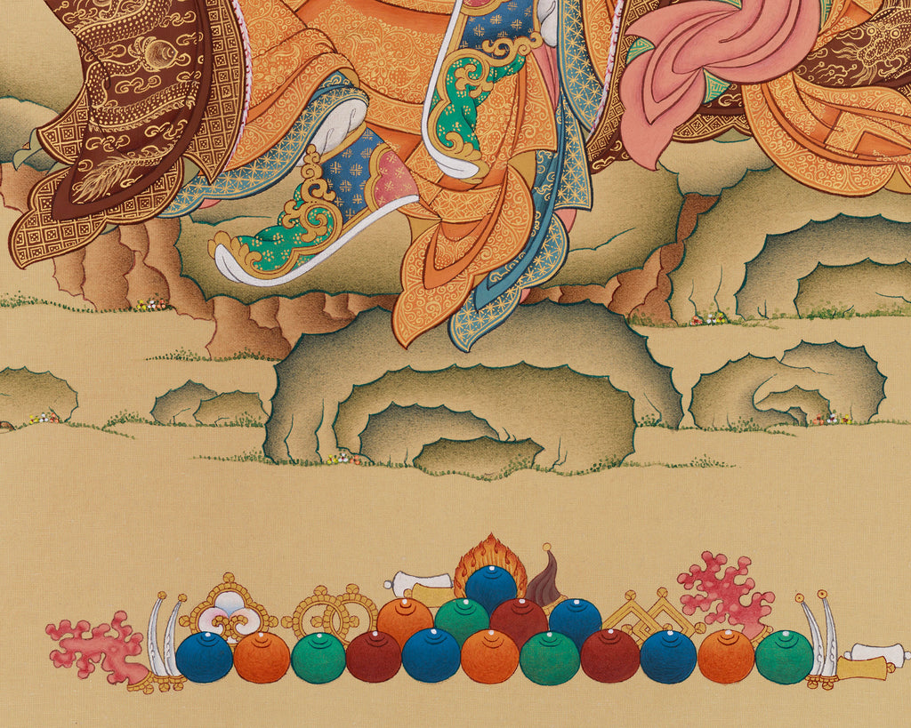 Padmasambhava, also known as Guru Rinpoche, founded Tibetan Buddhism and is credited with bringing the Buddha's teachings to Tibet in the 8th century. As a spiritual master, he embodies the union of wisdom and compassion and is revered for his transformative influence. In this Guru Rinpoche thangka, he is shown seated in meditation, holding the vajra and skull cup—symbols of tantric wisdom and his role as a guide on the path to enlightenment. His calm presence, surrounded by sacred symbols, calls for blessings of protection, wisdom, and spiritual growth. Display this sacred thangka in your home or meditation area to invite Guru Rinpoche's transformative blessings and deepen your practice.