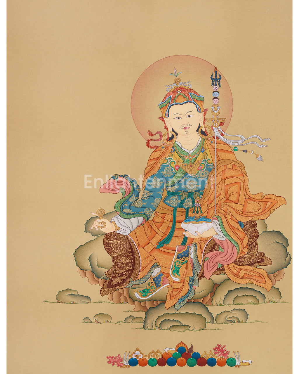 The Guru Rinpoche, the Second Buddha Thangka, is a masterpiece that beautifully embodies the divine presence of Padmasambhava in Tibetan Buddhism. Hand-painted with natural Lhasa stone colors and 24K gold on premium cotton canvas, this thangka is created in the traditional Karma Gadri style, capturing the sacred energy of Rinpoche in exquisite detail. The rich gold accents add depth and luminosity to the artwork, enhancing the Buddha’s radiant form. Every brushstroke is applied with care by our team of master artists, traditionally trained under the guidance of the Venerable Master Jamyang Phunshok of Kham, Eastern Tibet. This thangka not only reflects the profound spiritual power of Guru Rinpoche but also serves as a visual tool to support your practice and spiritual growth.