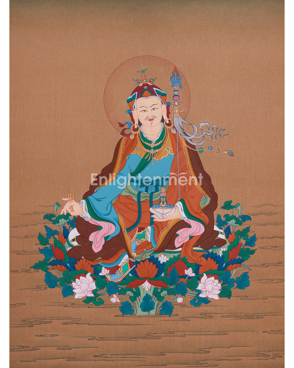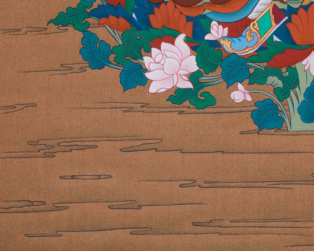 Guru Rinpoche, also known as Padmasambhava, is revered as the teacher who brought Buddhism to Tibet and is affectionately called the “Second Buddha.” In this exquisite painting, he is peacefully seated on a lotus throne, wearing the traditional lotus hat and gently holding a vajra and skull cup—emblems of his profound wisdom and enlightened power. His calm yet commanding expression seamlessly combines compassion with strength, inspiring practitioners and offering protection from obstacles. With its rich symbolism and expert craftsmanship, this thangka is more than mere art; it embodies a sacred presence, radiating blessings and guiding your spiritual path.