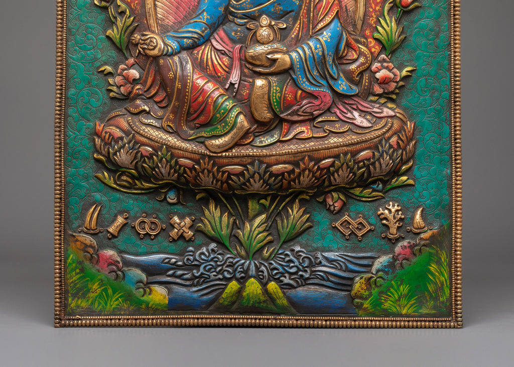 This Tibetan Buddhist wall hanging, crafted with rich workmanship, illustrates the Himalayan artists' deep artistic heritage. The combination of acrylic color and copper represents strength and transformation, resulting in a spiritually charged artifact with increased positive energy. Whether displayed as a focal point in your home, temple, or meditation space, this Guru Rinpoche wall art reminds you of enlightenment and divine direction.
