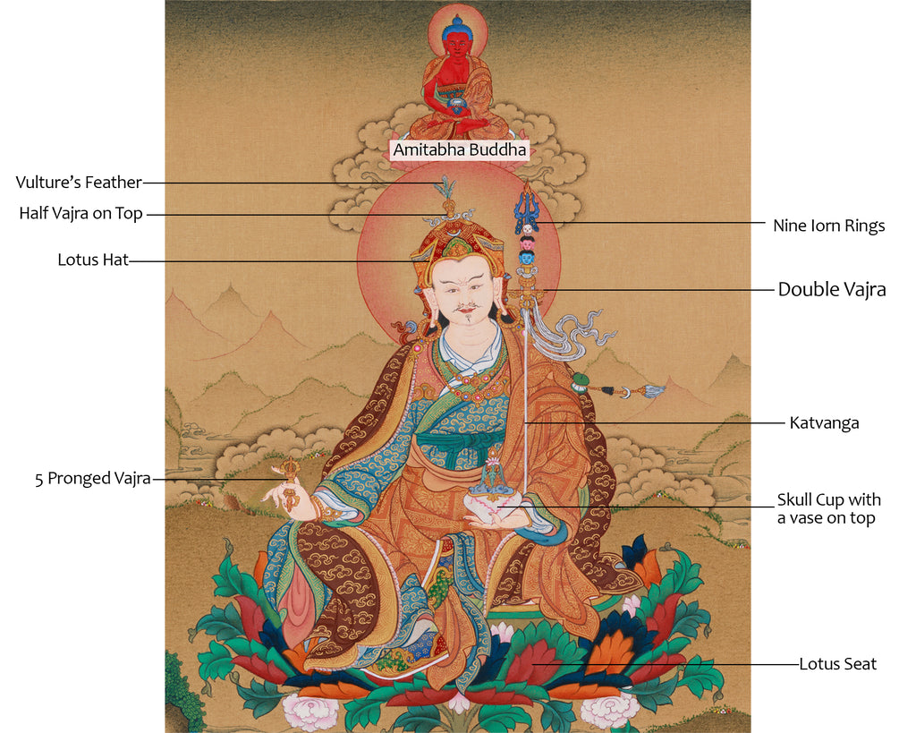 Guru Rinpoche is depicted wearing a lotus hat decorated with a vulture's feather and topped with a half-vajra, symbolizing his enlightened mind and unwavering awareness. He holds a five-pronged vajra in his right hand, demonstrating his capacity to overcome obstacles, and a skull cup filled with the nectar of immortality, representing his triumph over death and rebirth. The katvanga staff resting against his left shoulder signifies his tantric accomplishments, while the double vajra underscores his supreme leadership. Amitabha Buddha is seated upon a lotus seat above Guru Rinpoche, bestowing an everlasting abundance of wisdom and compassion upon the scene. This thangka is an exquisite work of art and a sacred devotional image, making it ideal for individuals seeking spiritual awakening, guidance, and excellence in their practice.