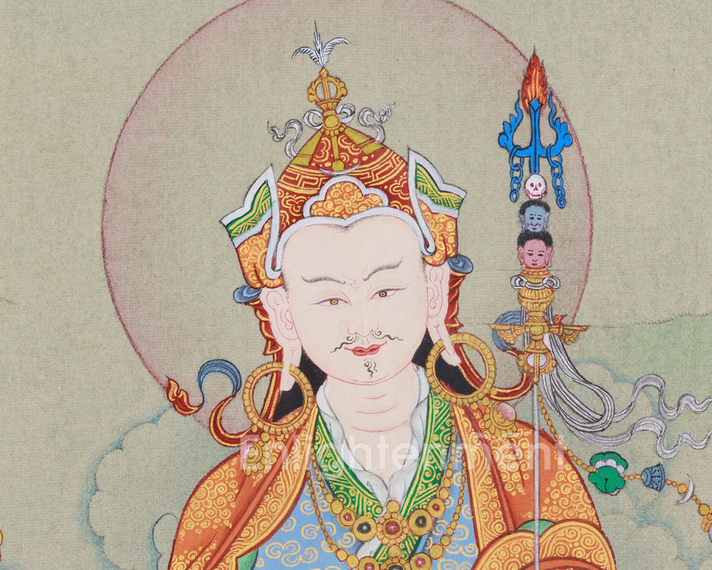 The delicate colors, intricate details, and sacred 24K gold make this thangka a spiritual meditation object and a beautiful Tibetan Buddhist art piece. It enhances any space, enriching your spiritual practice and connecting you with Guru Rinpoche's teachings.