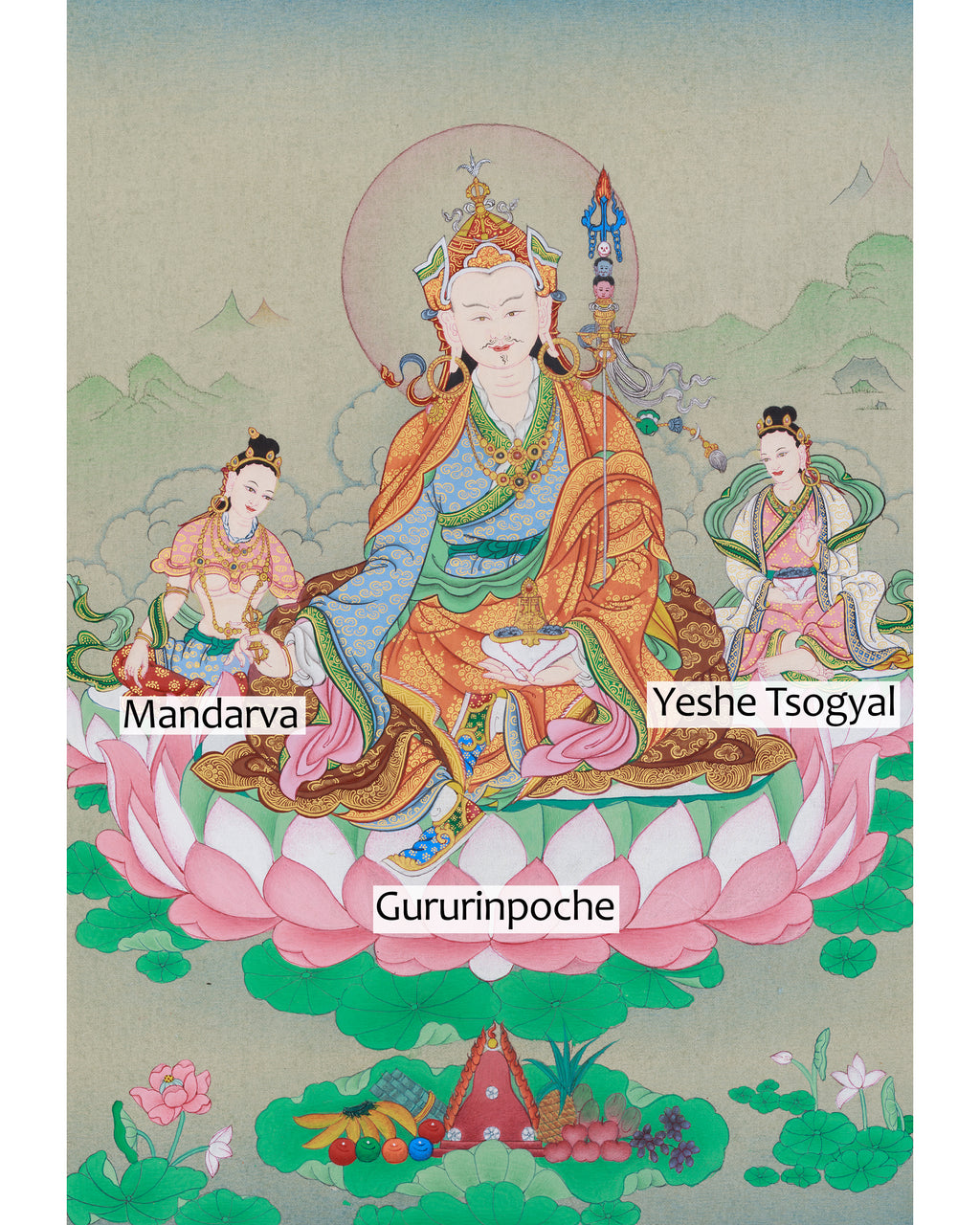 Guru Rinpoche, a revered figure in Tibetan Buddhism, is depicted in this painting alongside his consorts, Mandarva and Yeshe Tsogyal. These divine figures are shown in harmonious union, representing the deep bond between wisdom and compassion, a core principle of Vajrayana Buddhism. Guru Rinpoche is credited with bringing Buddhism to Tibet in the 8th century, and his consorts, Mandarva and Yeshe Tsogyal, are also renowned for their spiritual achievements and roles in Buddhist teachings. In this thangka, Guru Rinpoche is seated in a meditative posture, emanating calm wisdom and compassion, while Mandarva and Yeshe Tsogyal sit beside him, exemplifying the strength and purity of enlightened beings.