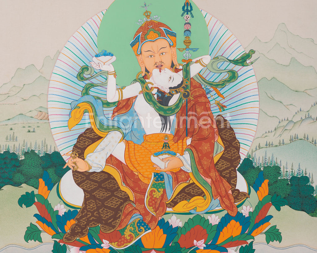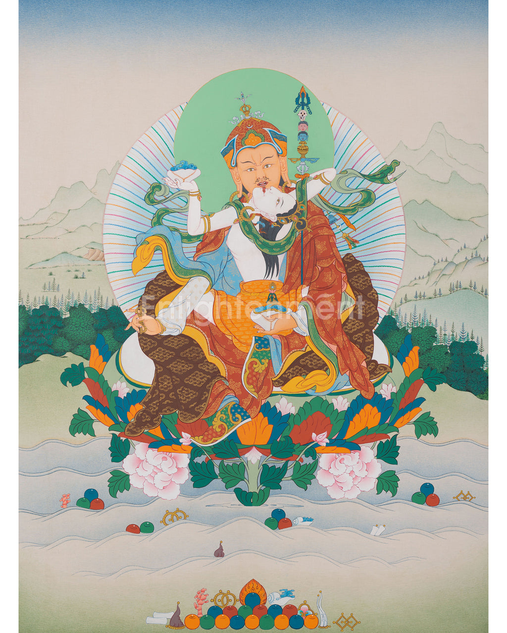 The thangka's gentle lines highlight Guru Rinpoche’s peaceful face and noble posture as he holds symbols of wisdom. Yeshe Tsogyal, graceful and serene, leans into him, illustrating their spiritual connection. They rest on a lotus throne above a tranquil lake, symbolizing rebirth and purity. The mountain and mist backdrop evoke a sense of calmness and reflection, making it ideal for meditation and a valuable addition to any collection.