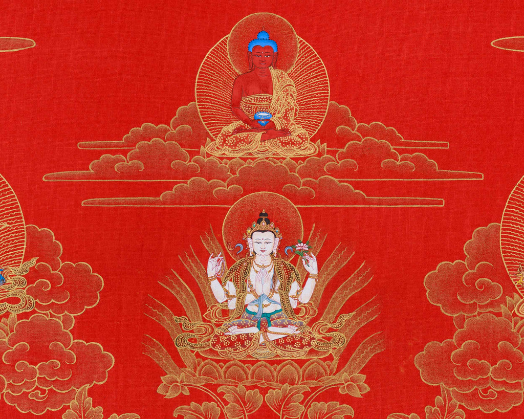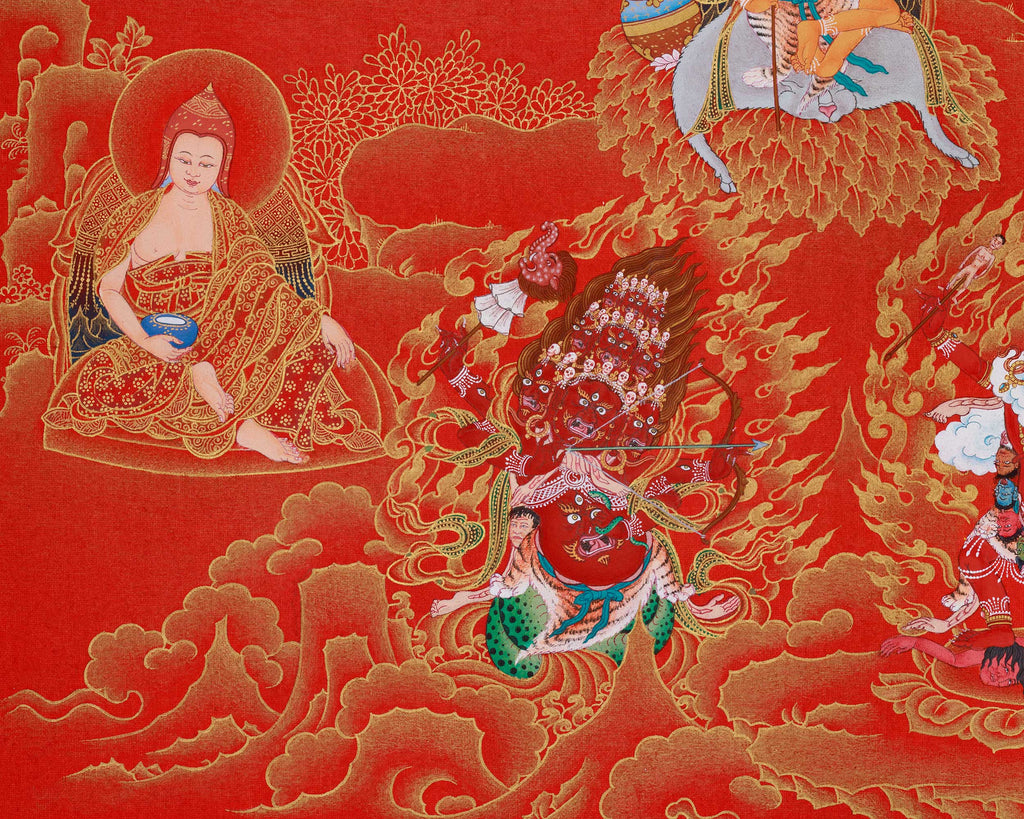 Experience the divine aura of the Guru Sangye Thangka, an exquisite piece of spiritual artwork that emanates the transformative energy of Guru Rinpoche, also known as the "Second Buddha." Created meticulously by hand on high-quality cotton canvas using acrylic paints and authentic 24K gold, this remarkable thangka is rendered in the traditional Nakthang (Gold on Red) style. The prominent gold embellishments against the rich red background serve to enhance Guru Rinpoche’s divine wisdom, authority, and compassion. Each detailed element has been carefully applied to embody the sacred presence of Guru Rinpoche, transforming this thangka from merely a visual artwork into a potent spiritual instrument for invoking blessings and protection.