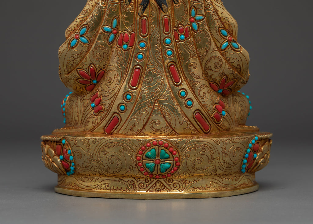 This Respected Guru Tsokye Dorje Golden Statue stands at 10.6”/27cm in height and 6.7”/17cm at the base, weighing 2.41 kg. Made from 24K Gold Gilded, Gold & Acrylic Paintings, Copper Body, and adorned with hand-carved gemstones, this statue exemplifies refined craftsmanship. Expertly created by skilled Nepali artisans, it makes a meaningful addition to altars, meditation spaces, or personal spiritual collections.