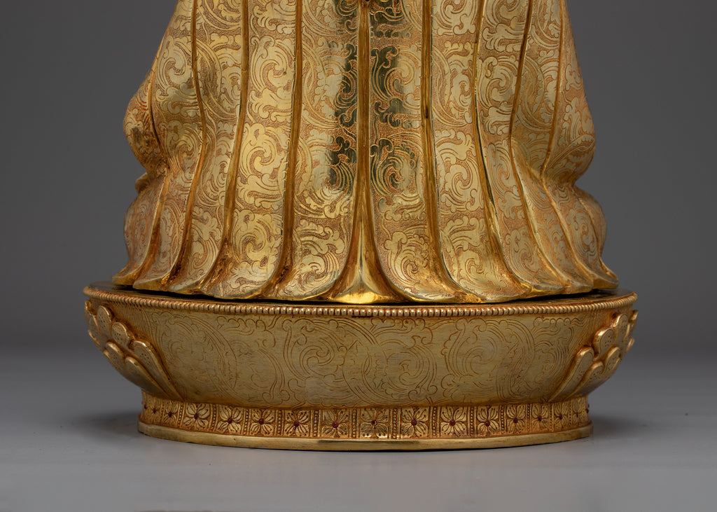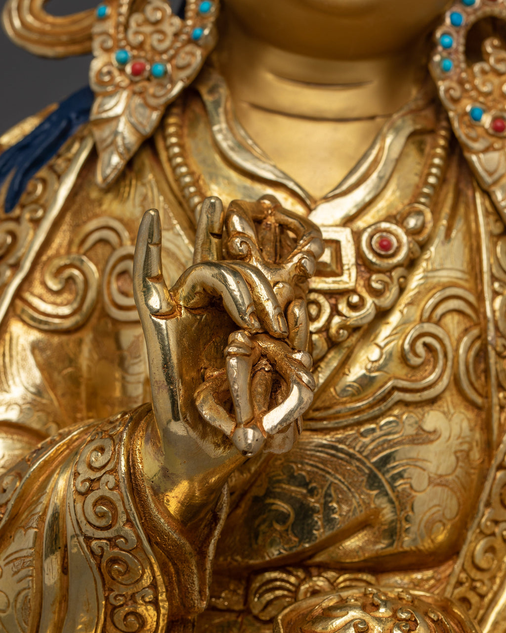 Guru Tsokye Sculpture stands 18.7” (47.5 cm) tall with a base width of 12.0” (30.5 cm) and weighs 8.90 kg. Handcrafted from a copper body, 24K gold gilding, intricate gold and acrylic paintings, and gemstones. This powerful form embodies transformation, protection, and spiritual realization. Ideal for temple spaces, personal shrines, or advanced practitioners, the statue serves as a profound reminder of the mastery of the tantric path and the compassionate power of the awakened teacher.