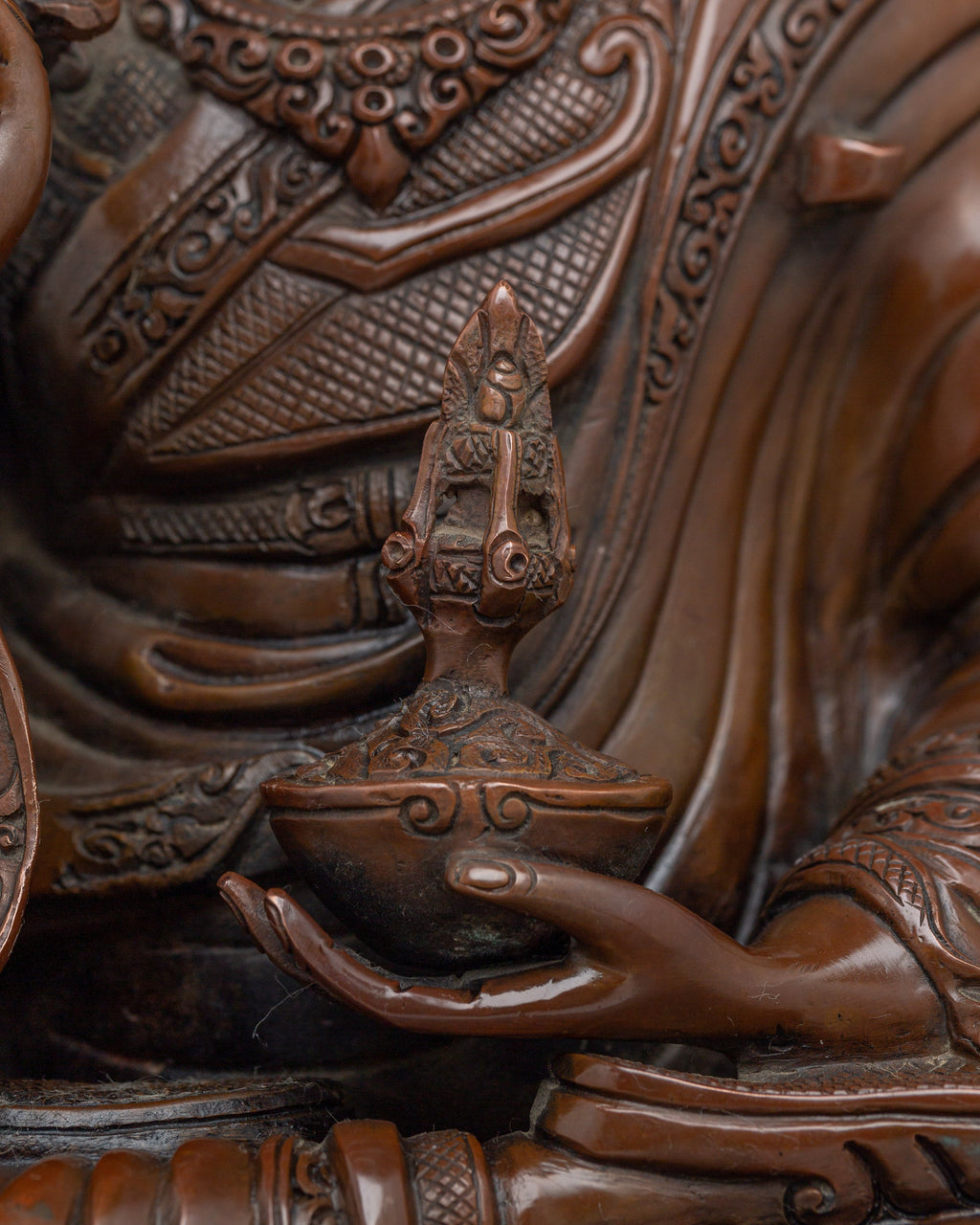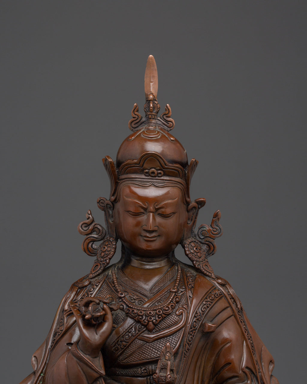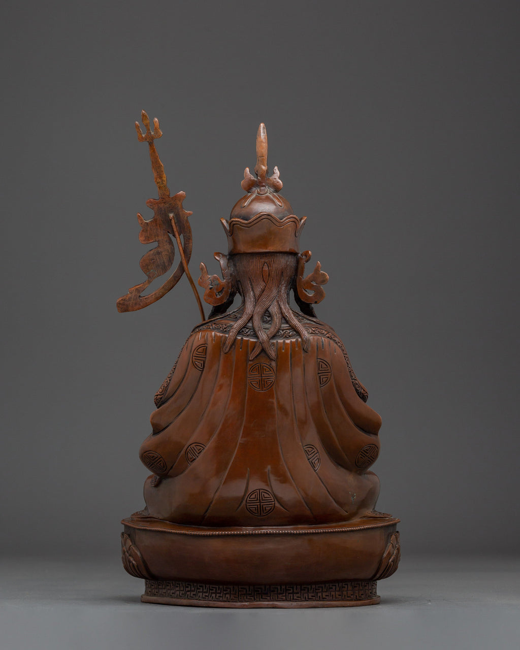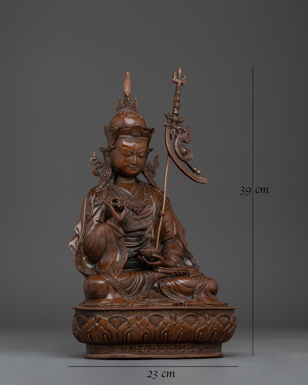 This Tibetan Buddhist Guru Tsokye Statue stands at 15.4”/39cm in height and 9.1”/23cm at the base, weighing 4.98 kg. Crafted from oxidized copper, this piece embodies the traditional craftsmanship of the Himalayas. Expertly made by skilled artisans, it is a meaningful addition to altars, meditation spaces, or spiritual collections.