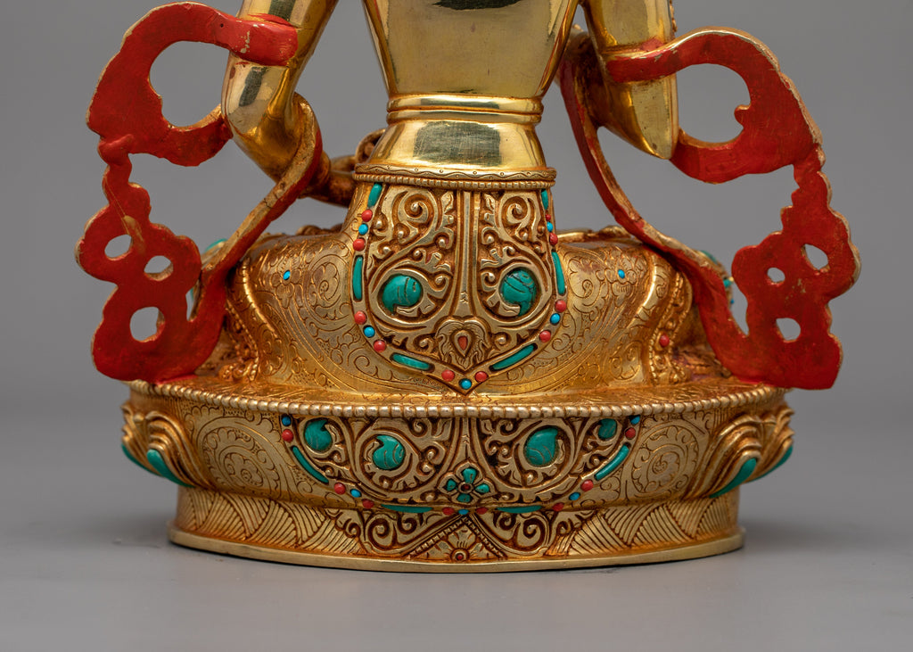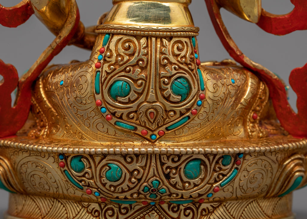This Guru Vajrasattva Purification Deity Sculpture, known as a symbol of purity and wisdom, represents spiritual purification and the removal of obstacles on the path to enlightenment. This handcrafted statue, measuring 11.8" (Height) x 7.7" (Base) and weighing 2.22 kg, is made of copper body and adorned with handcarved gemstones and 24K gold gilding, as well as gold and acrylic paint work. Crafted by expert Nepalese artisans, this sacred item embodies the rich traditions of Himalayan Buddhism, making it an important addition to altars, meditation areas, or sacred collections.
