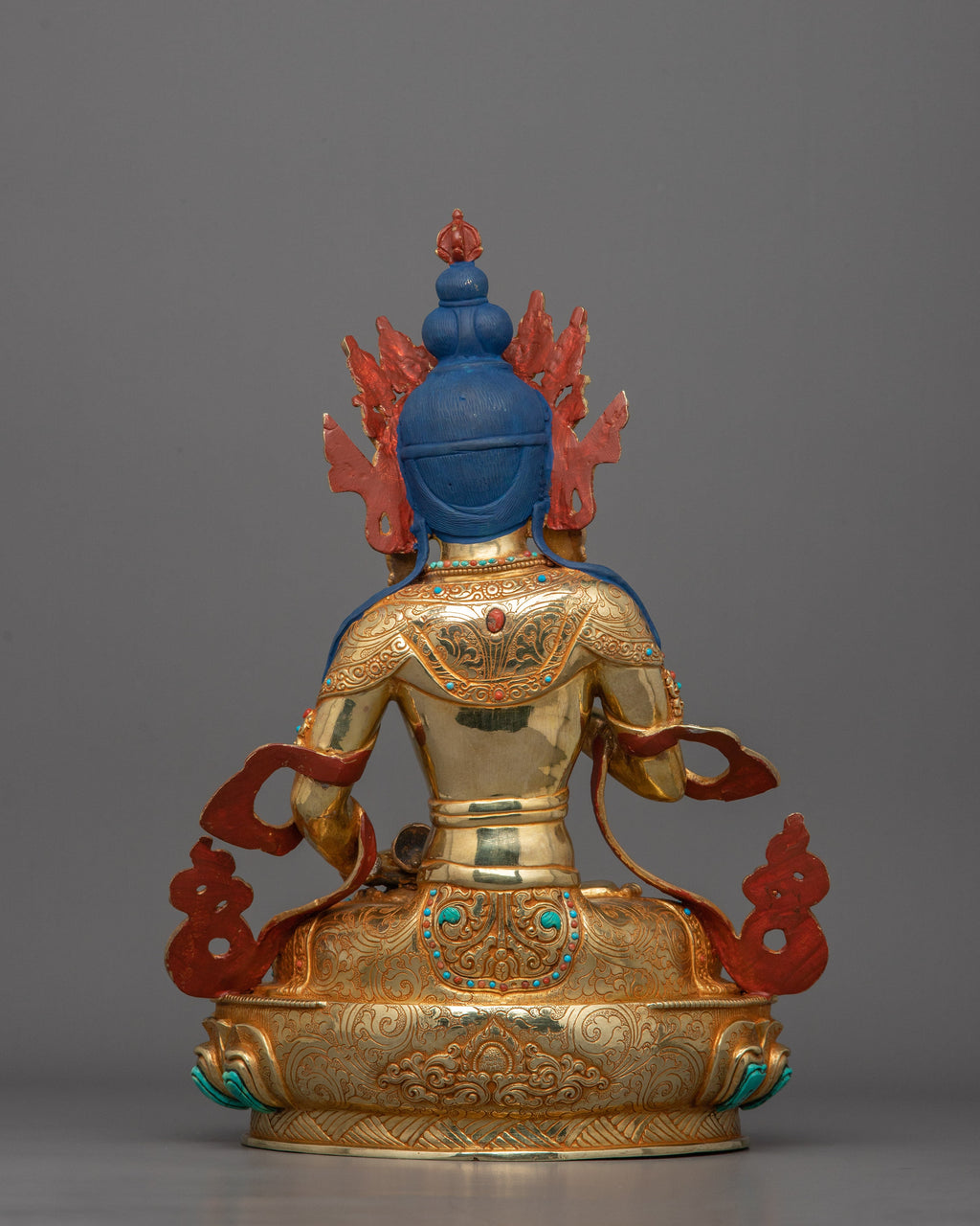 The Guru Vajrasattva Sacred Deity is a piece of spiritual artistry, standing 14.2 inches (36 cm) in height with a base width of 10.2 inches (26 cm). Crafted from a copper body, it is adorned with 24K gold gilding, giving it a divine presence. The statue features intricate gold and acrylic paintings which highlight its fine details and vibrant design. Hand-carved gemstones add a sacred touch, enhancing its spiritual significance.