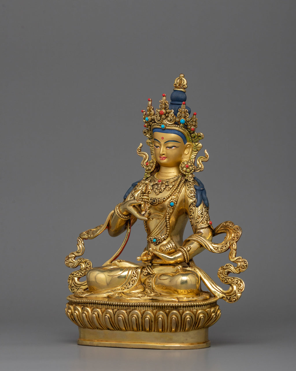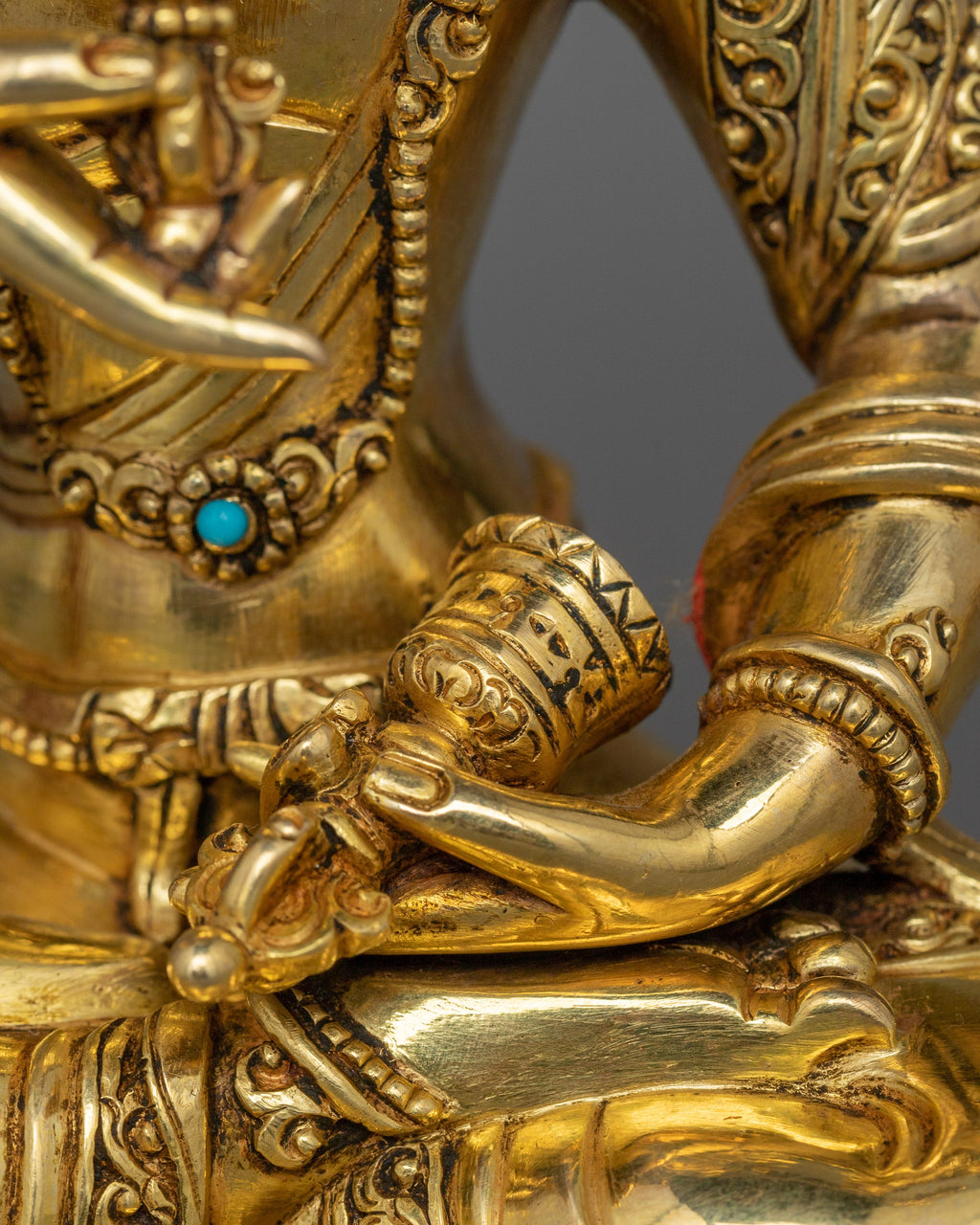 The Guru Vajrasattva Statue for Your Space is a crafted spiritual piece, standing 9.1 inches (23 cm) in height with a base width of 10.8 inches (27.5 cm). Made from a copper body, the statue is 24K gold gilded, giving it a radiant and divine appearance. The fine gold and acrylic paintings highlight the intricate details, adding vibrancy and depth to the design. Embellished with gemstones, the statue exudes a sense of spiritual significance.