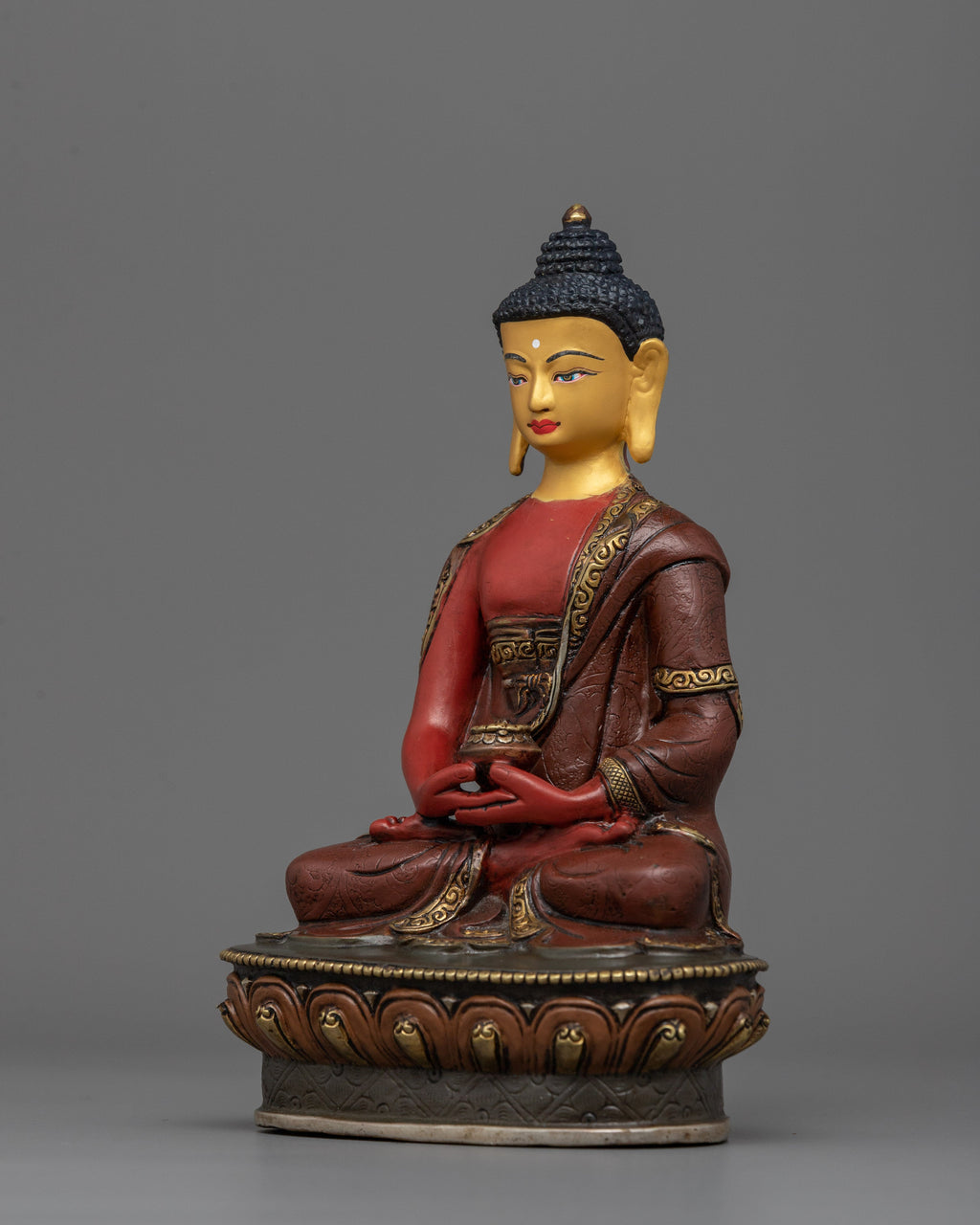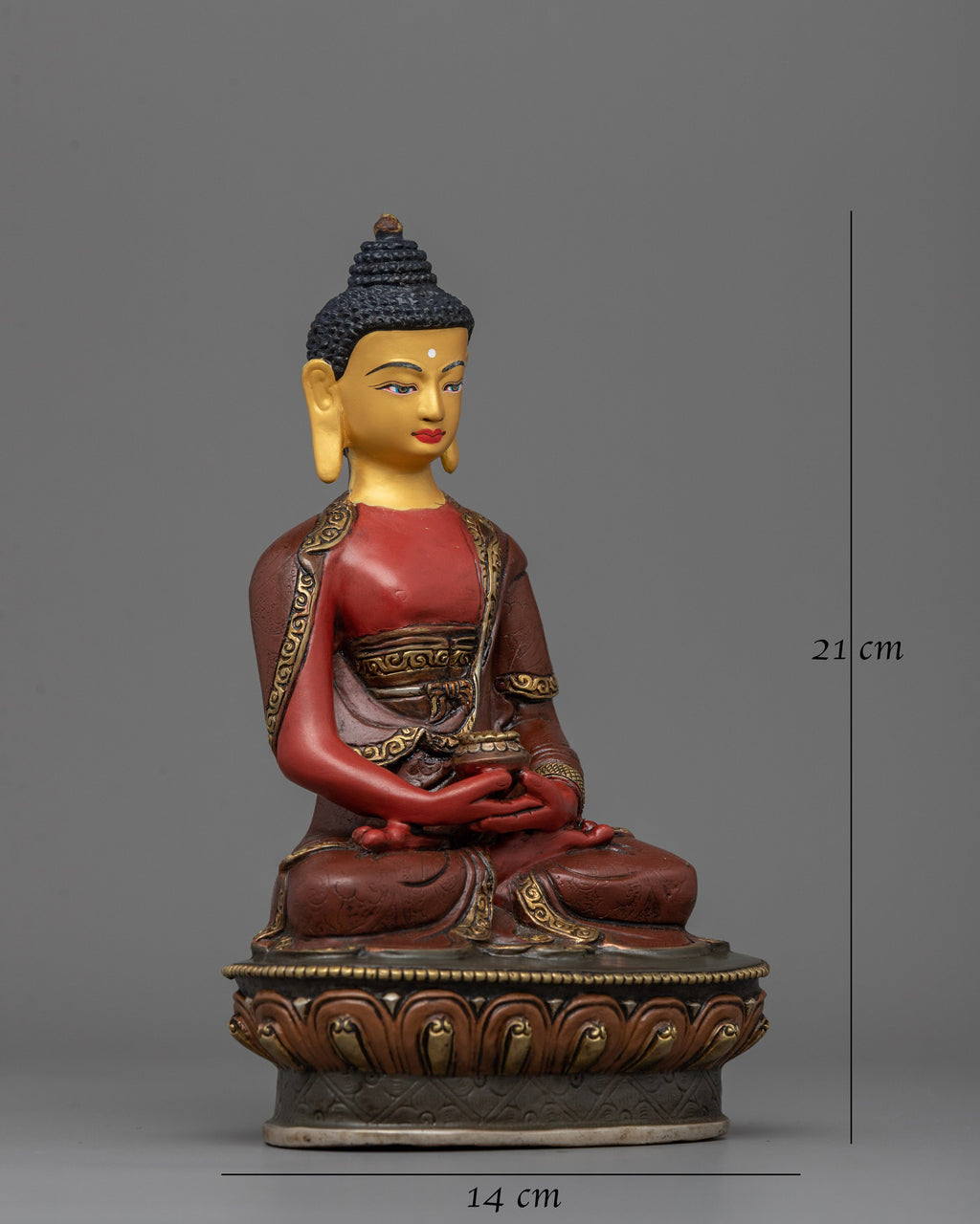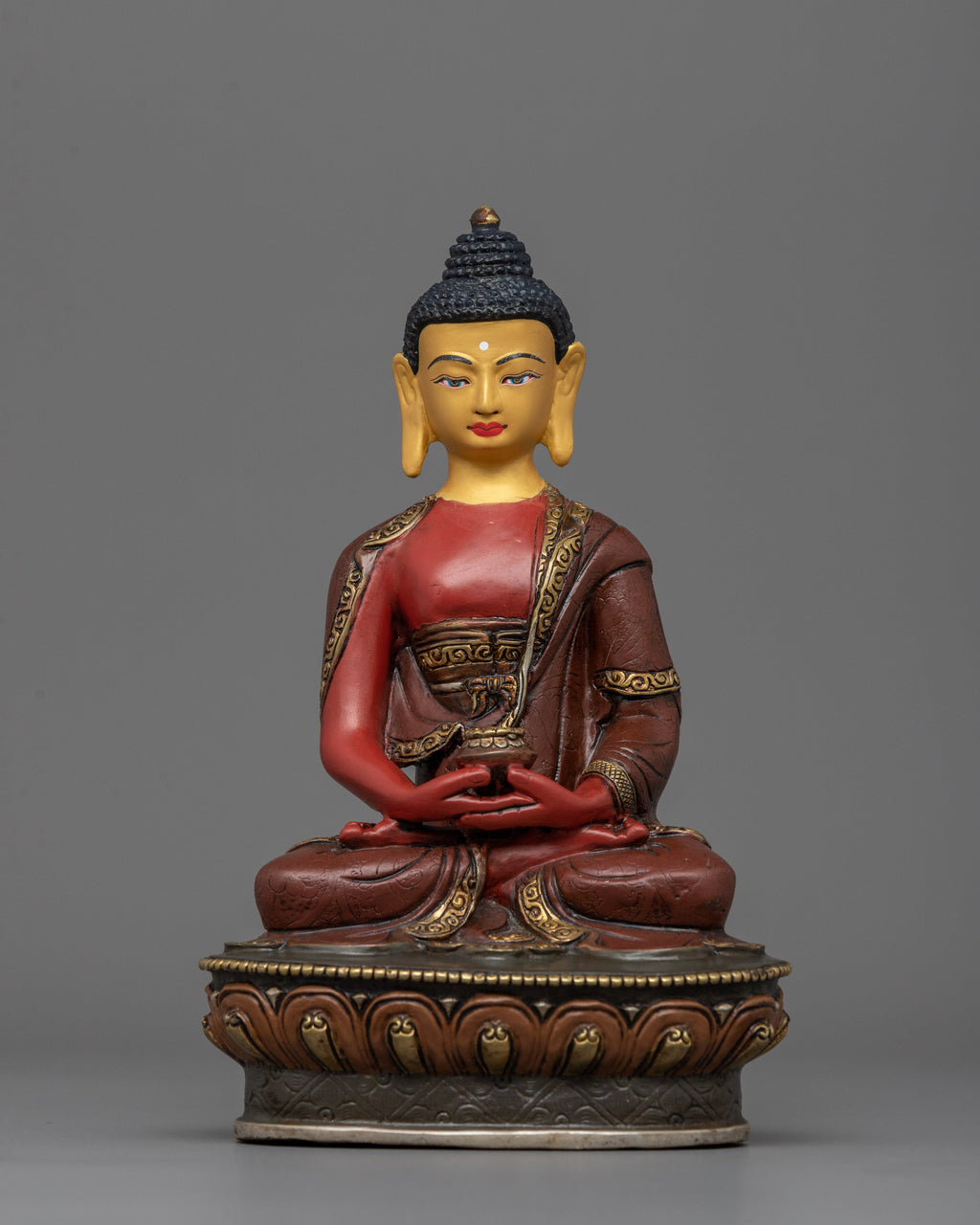 Amitabha is shown in a tranquil sitting stance, holding a begging bowl in his lap to symbolize renunciation and the simplicity of the enlightened life. His peaceful countenance represents the knowledge and compassion he bestows on individuals seeking rebirth in his Pure Land, Sukhavati. This statue, with its gold highlights and oxidized copper details, is a profound spiritual item suitable for devotional practice, meditation, or contemplation of Amitabha's teachings on unlimited light and boundless compassion.
