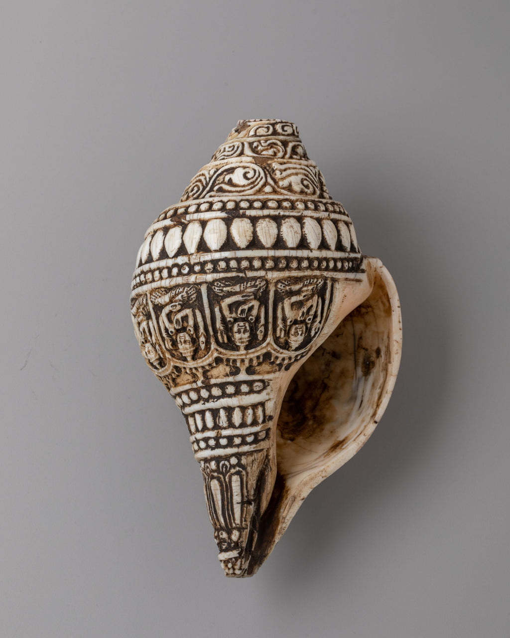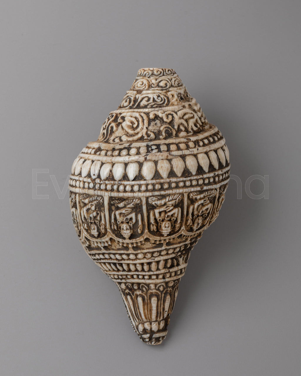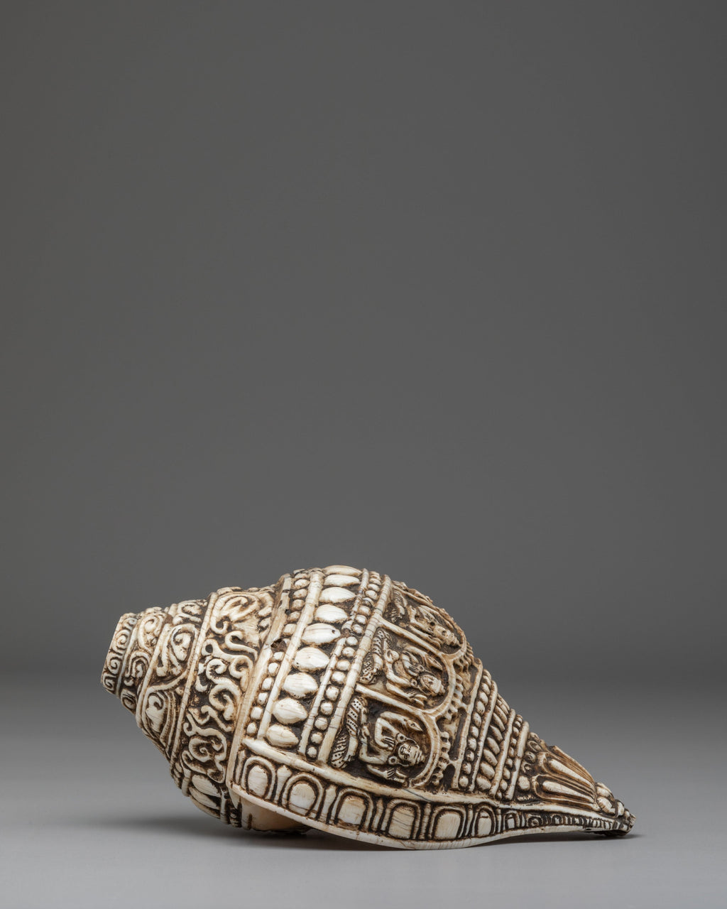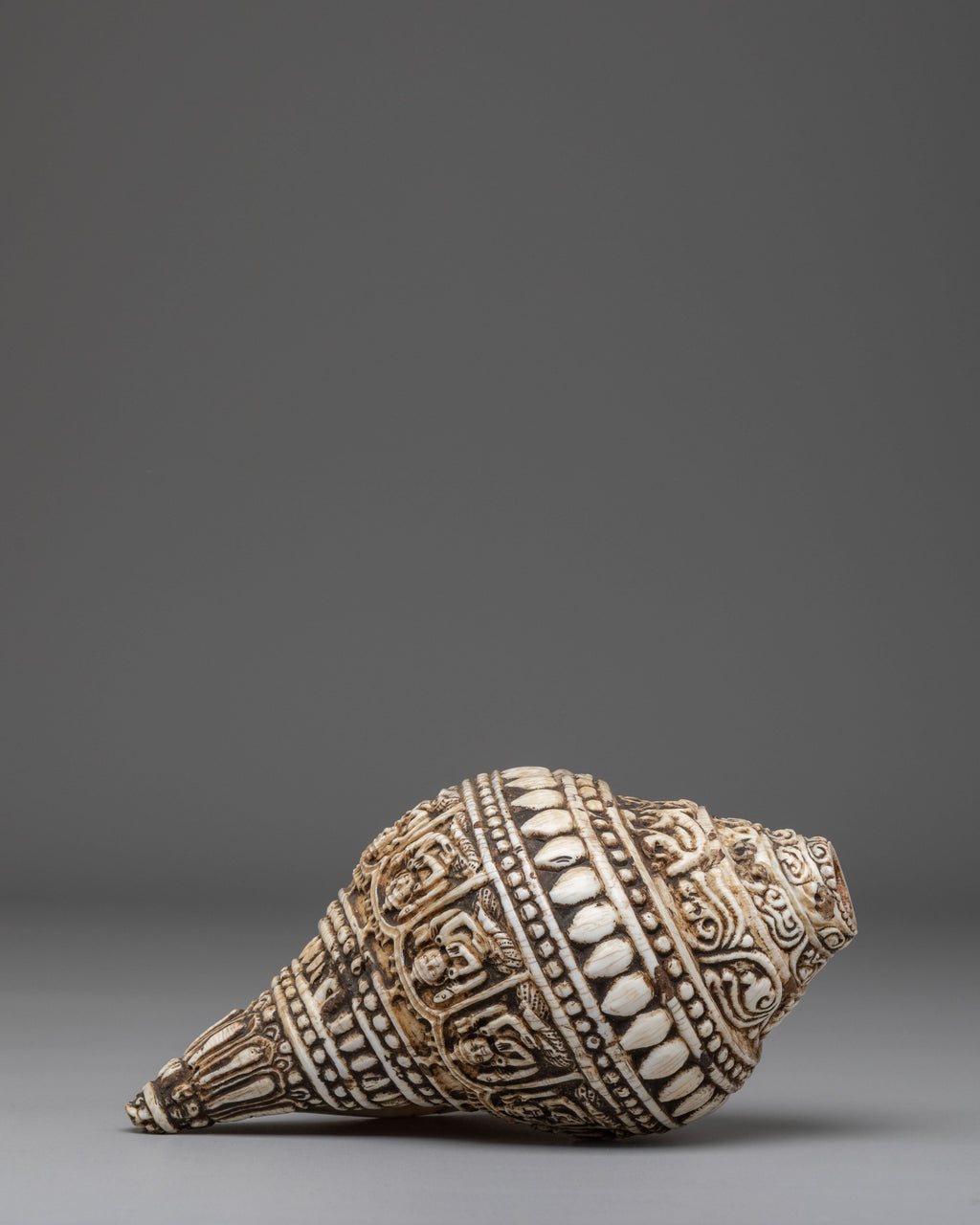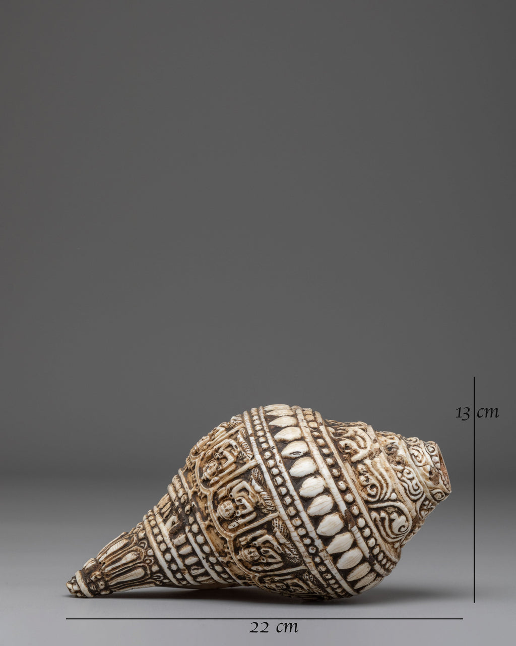 This hand-carved Tibetan Conch Shell is a gorgeous and precious ritual instrument measuring 13cm in height and 22cm in breadth, weighing 1.33kg. This item, handcrafted from a genuine conch shell and expertly carved with exquisite Tibetan designs, is both a functioning spiritual instrument and a beautiful piece of spiritual decor.