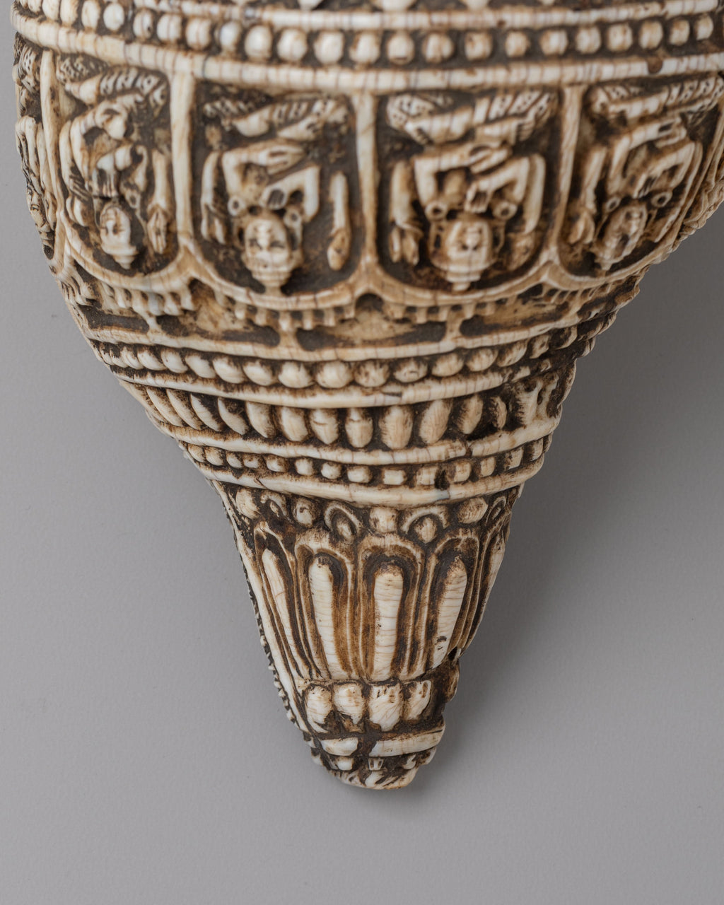 In Buddhist worship, the conch shell is used as a trumpet or offertory receptacle and represents Buddha's spoken voice. It is one of the eight lucky Buddhist symbols, reflecting the victory of Buddha's teachings, which spread omnidirectionally like a conch shell's voice. The conch shell is a sign of power, authority, and sovereignty; its sound is thought to ward off evil spirits, prevent natural disasters, and frighten away dangerous creatures.