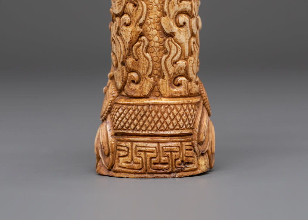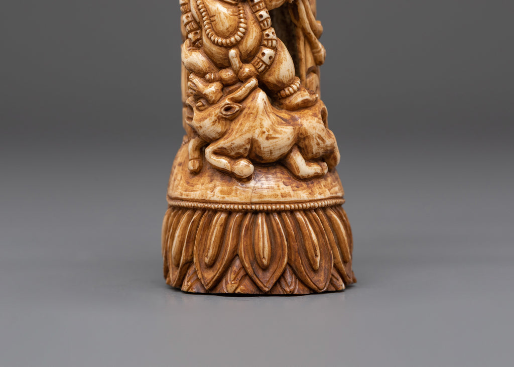 The Yamantaka statue depicts the deity in a forceful and dynamic position. Yamantaka's numerous heads and arms represent the defeat of ignorance and triumph over obstacles. His wrathful aspect represents power and transformation, while his symbolic weapons, such as the vajra and lotus flower, signify spiritual purity and clarity. The buffalo bone was chosen for its connection to the soil, which represents grounding, strength, and protection for the practitioner. Detailed engravings and the natural texture of the bone contribute to the statue's spiritual resonance and artistic depth.