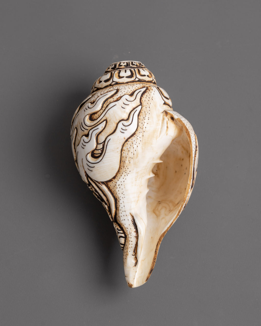 In Buddhist worship, the conch shell is used as a trumpet or offertory receptacle and represents Buddha's spoken voice. It is one of the eight auspicious Buddhist symbols, reflecting the victory of the Buddha's teachings, which spread omnidirectionally like the sound of a conch shell. The conch shell is a symbol of power, authority, and sovereignty; its sound is believed to ward off evil spirits, prevent natural disasters, and deter dangerous creatures.