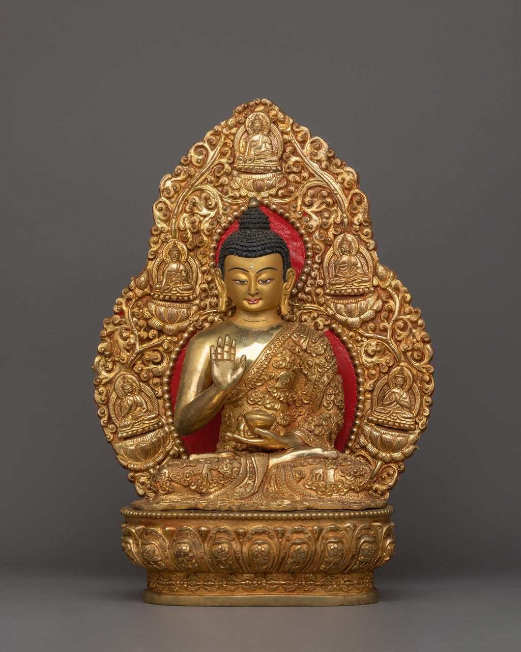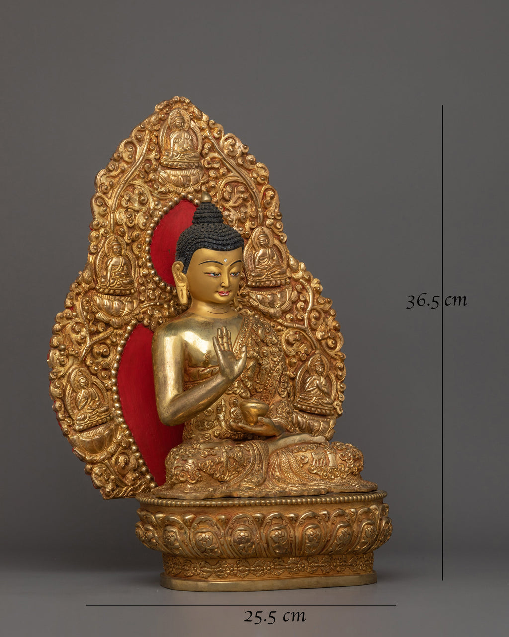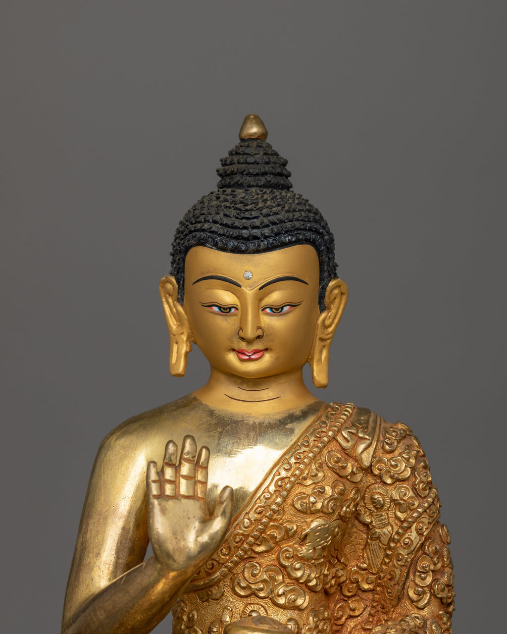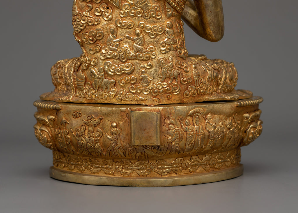 The Buddha is depicted seated atop a moon disc lotus seat. His right-hand forms the "Abhaya mudra," or the mudra of fearlessness, symbolizing his protection and dispelling of fear, and his left hand carries an alms bowl, an indication of the monastic life he led. The intricate details done by our artists for several months on this statue will catch the eye and imbue any space with a sense of calm and serenity.