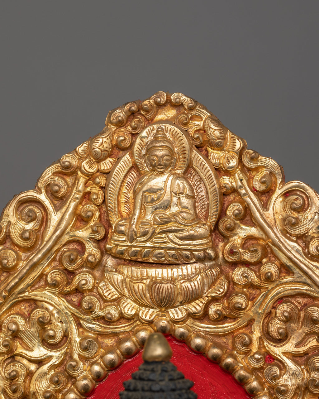 This Handmade Amoghasiddhi Buddha statue embodies the wisdom of all-accomplishing action and the transformation of envy into enlightened activity. Seated in the Abhaya Mudra, this statue measures Size: 14.4”/36.5cm (Height) x 10”/25.5cm (Base) Weight: 4.08 kg. Sculpted from pure copper and gilded in 24K gold, this intricately detailed statue is adorned with gold and acrylic paintings.