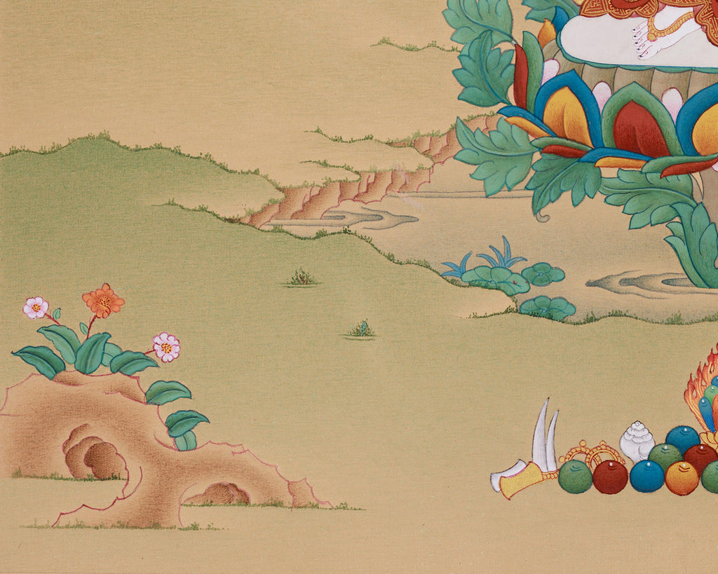 In this thangka, Chenrezig is beautifully depicted with his 1000 arms, each hand holding a different sacred object to symbolize his varied methods of compassion. His arms stretch outward in every direction, with eyes on each palm representing his ability to see and alleviate suffering wherever it exists.