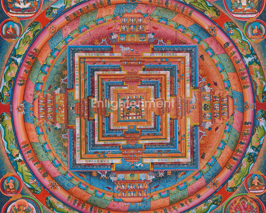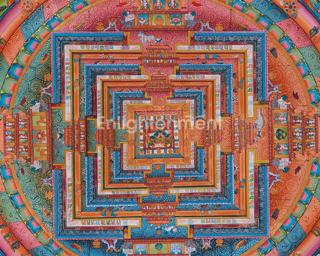 The mandala's intricate design consists of multiple concentric circles, representing different realms of existence, various levels of consciousness, and stages of spiritual awakening. At the center of this mandala, a deity or enlightened figure resides within a multi-layered palace structure, signifying the ultimate seat of wisdom, enlightenment, and spiritual awakening. Each layer of the square palace, adorned with ornate gateways and vibrant colors, represents a different stage of spiritual progression, guiding practitioners inward toward enlightenment. The mandala is surrounded by a group of Buddhas, protectors, and deities, which emphasizes the spiritual value of the sacred artwork.