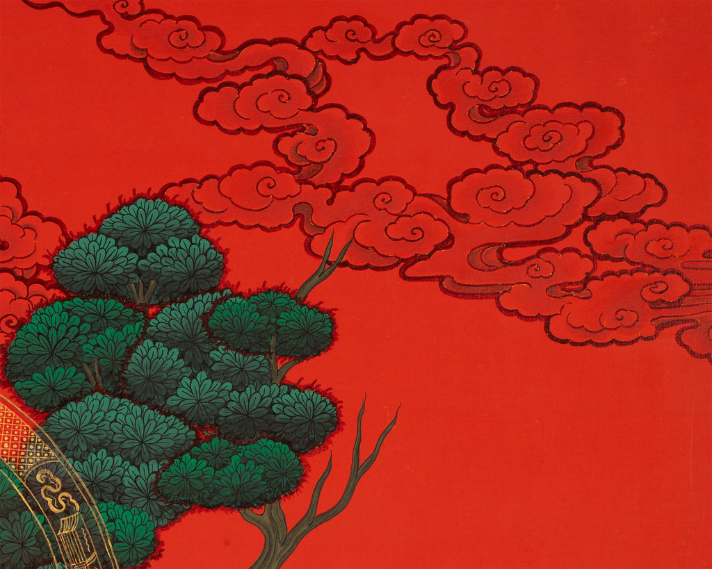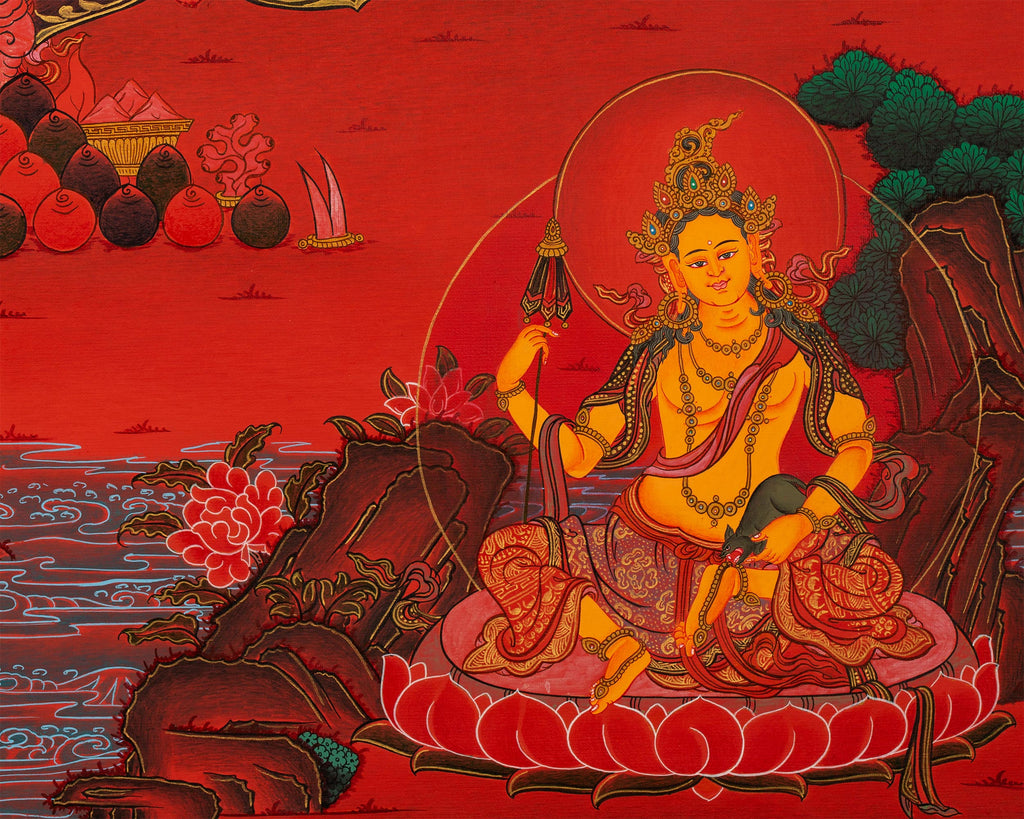 Embrace prosperity and artistry with this hand-painted Namtoshe Thangka, created by a skilled Nepali artist. Painted on red cotton canvas with acrylic pigments and 24K gold, it radiates visual splendor and spiritual significance. The red symbolizes power, wealth, and vitality, while gold details emphasize its sacred brilliance, symbolizing abundance and divine protection. Every brushstroke reflects devotion, mastery, and spiritual precision, making this artwork a vessel of blessings and fortune.