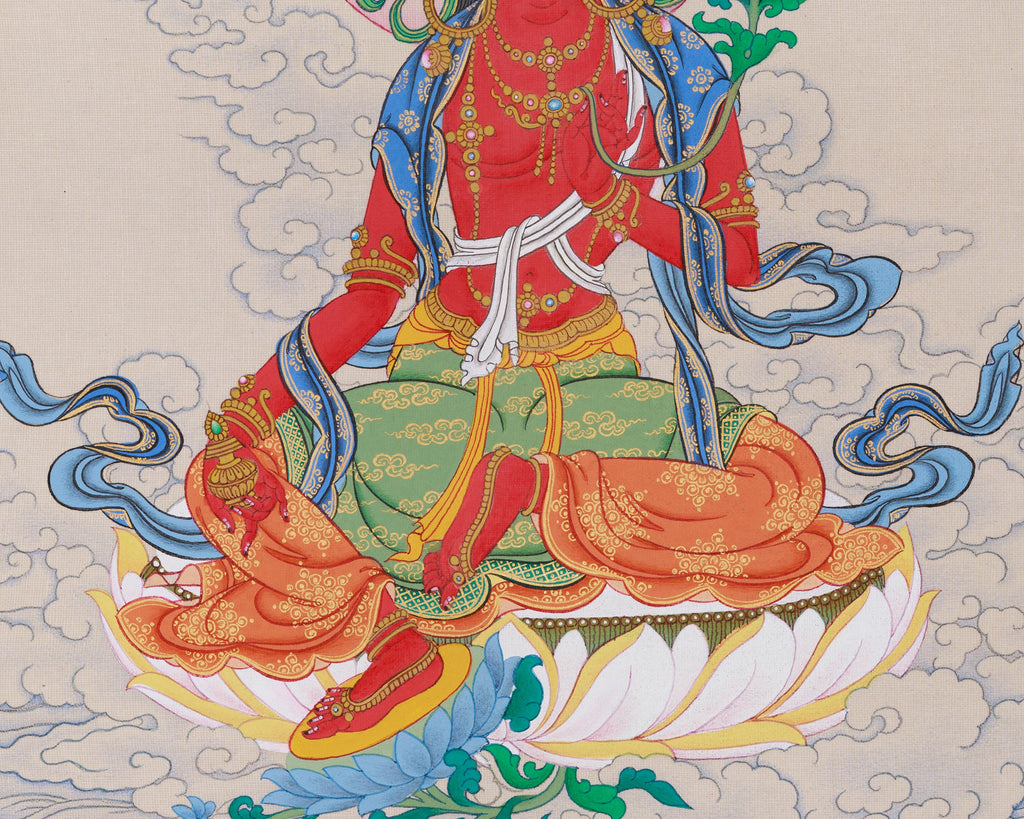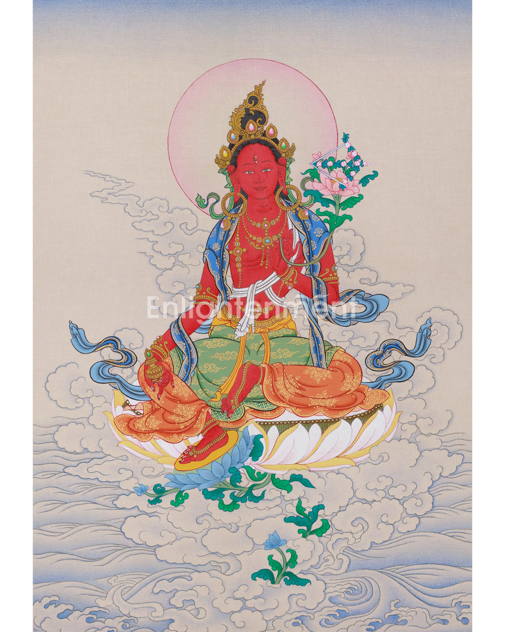 Red Tara, representing magnetic energy and enlightened activity, appears in her red form, radiating warmth, strength, and compassion. She sits on a blooming lotus, with a five-jeweled crown symbolizing the five transcendent wisdoms. Her left hand holds an utpala lotus, a bow, and an arrow, symbolizing her power to attract good fortune and spiritual insight. In her right hand, she cradles a nectar-filled vase, signifying the blessings and healing she bestows upon all beings. Every part of her, from her detailed garments to her balanced posture, encourages practitioners to connect with her vibrant, freeing energy—a source of fearless compassion and transformative grace.