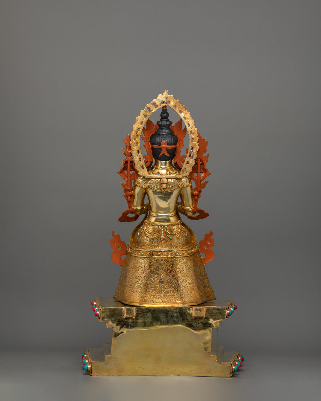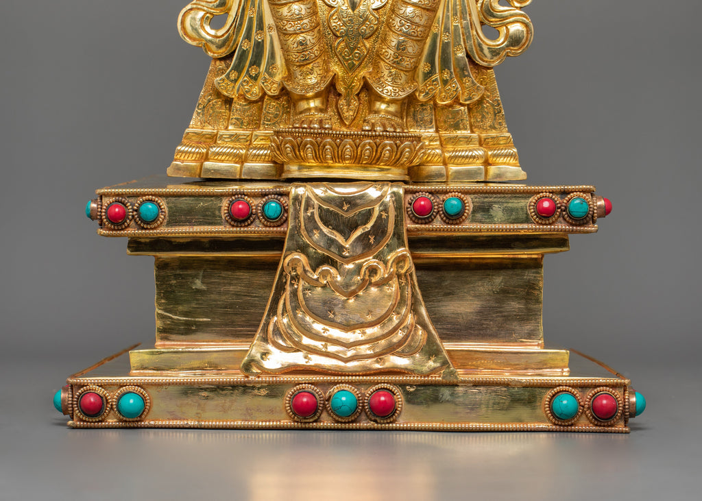 The Maitreya statue is depicted seated on an exquisitely designed throne, embodying serenity and divine grace. The throne itself is a work of art, symbolizing reverence and sanctity. It is adorned with intricate carvings, and auspicious symbols, representing the profound teachings of Buddhism. The throne highlights the skill of Nepali artisans who bring it to life with intricate detailing and symmetrical patterns.